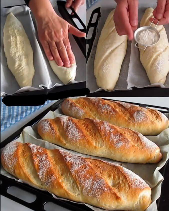 Verwarm de oven voor op 220°C. Maak met een scherp mes een paar schuine inkepingen aan de bovenkant van de baguettes. Besprenkel de ovenbodem met een beetje water om stoom te creëren. Bak 20-25 minuten tot de baguettes goudbruin en knapperig zijn.