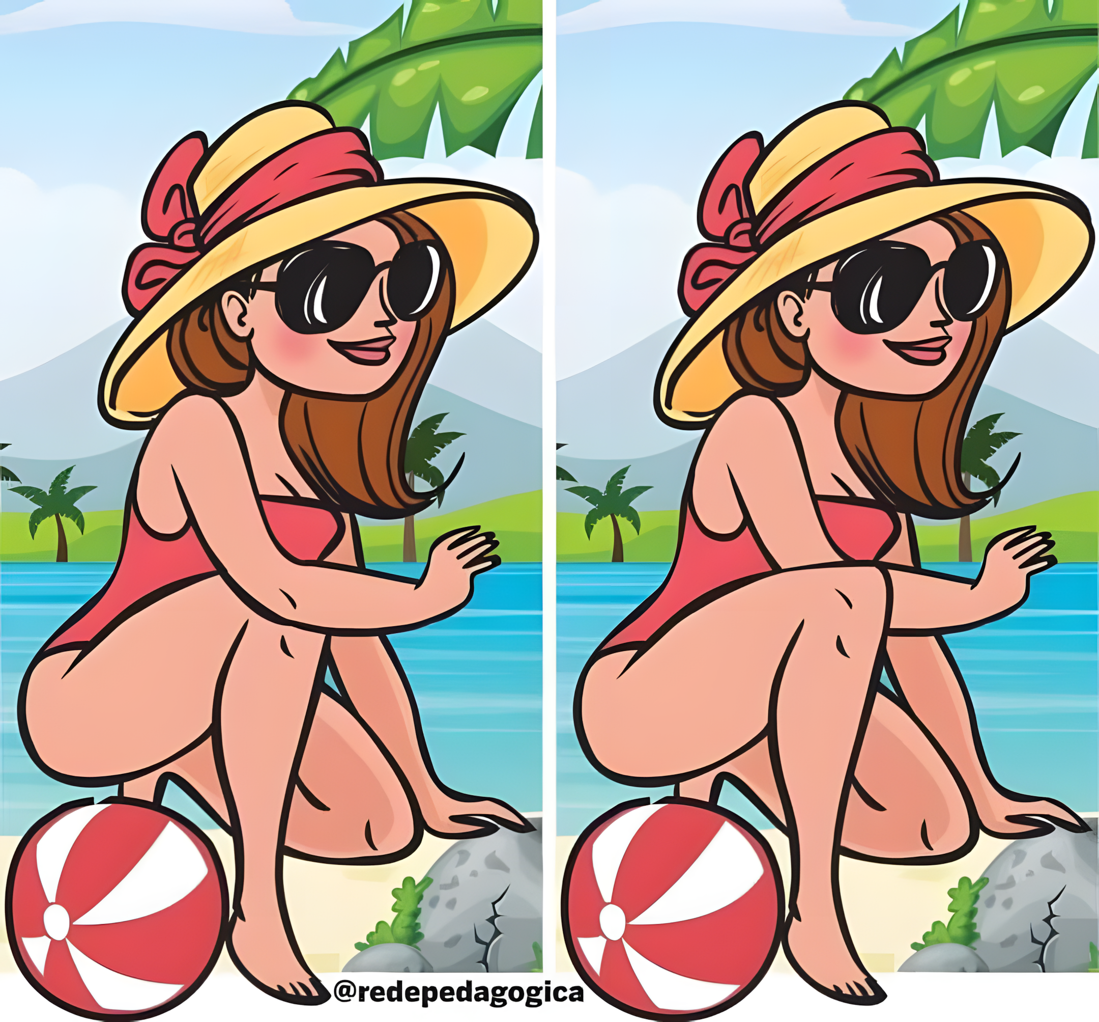 De scĆØne lijkt simpel: een vrouw hurkt aan de waterkant, gekleed in een rood badpak, een hoed, een zonnebril, een strandbal aan haar voeten en een prachtig tropisch uitzicht op de achtergrond. Maar als je goed kijkt, veranderen de details subtiel van beeld tot beeld. Dit spel, dat vaak aan kinderen wordt voorgesteld, is eigenlijk een uitstekende concentratie- en geheugenoefening voor alle leeftijden.