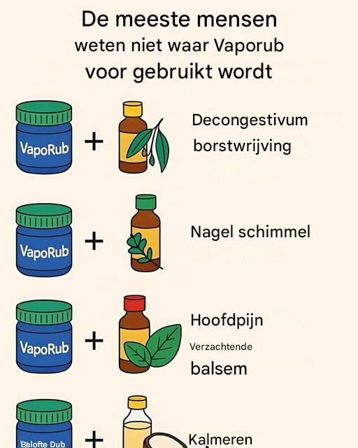 Vaporub wordt vaak geassocieerd met verkoudheid en verstopping. Maar wist u dat deze muntachtige zalf nog veel meer te bieden heeft? Van het verzachten van spieren tot het verzorgen van de huid, dit onmisbare product in onze medicijnkastjes kan een waardevolle multifunctionele bondgenoot blijken. Ontdek hoe u het anders kunt gebruiken en profiteer van de vaak over het hoofd geziene voordelen!