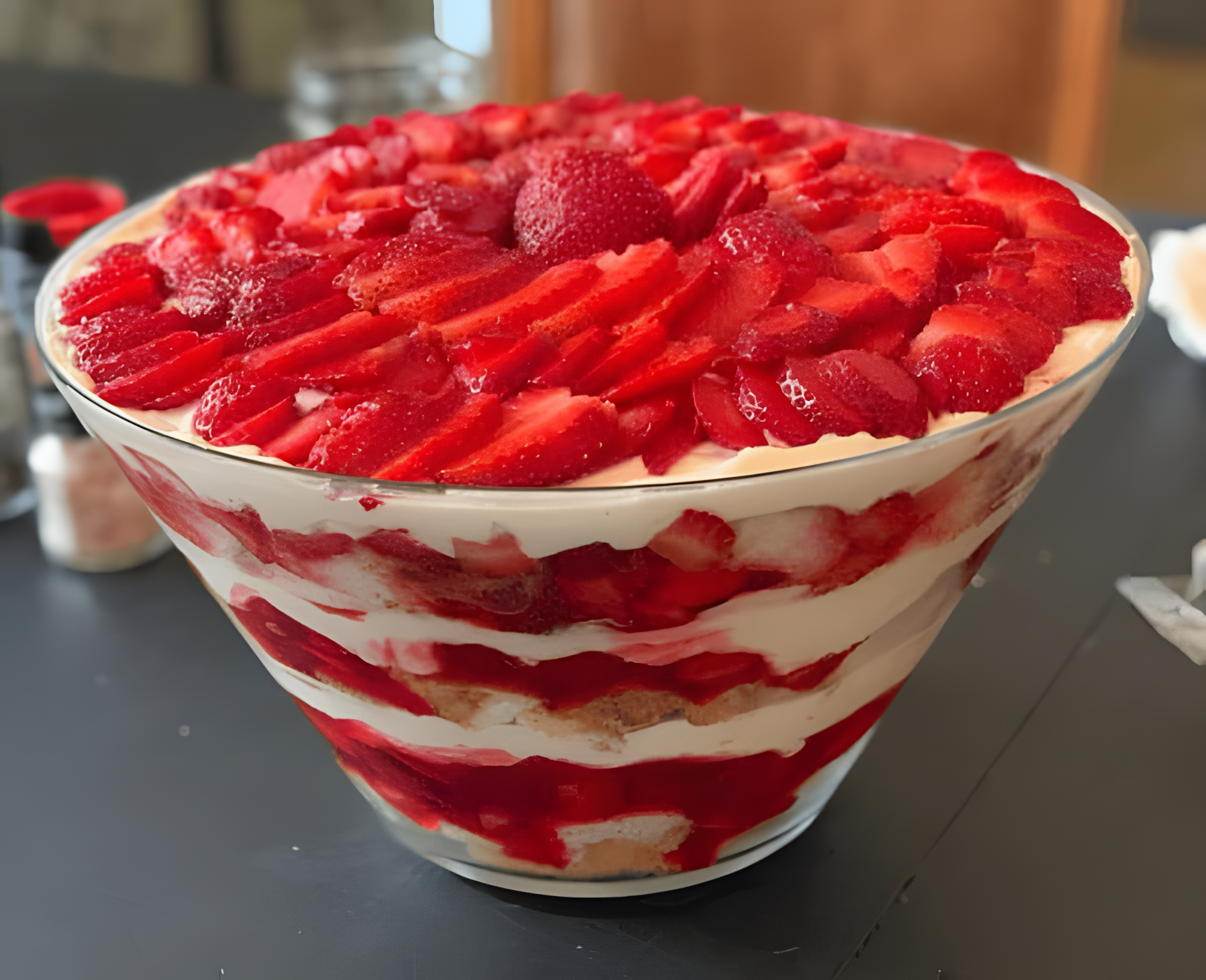 Een prachtige, luchtige en romige trifle met verse aardbeien, zachte cheesecakevulling en smeuïge cake. Perfect voor feestjes en familiebijeenkomsten!