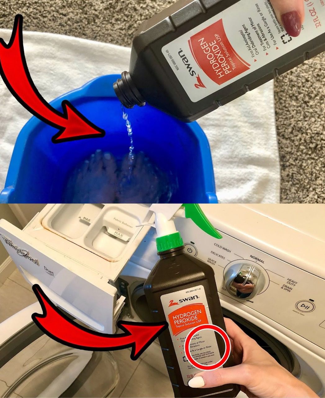 U hoeft alleen maar 1 eetlepel waterstofperoxide op te lossen in een half glas water en het mengsel vervolgens in de trommel van de wasmachine te doen.