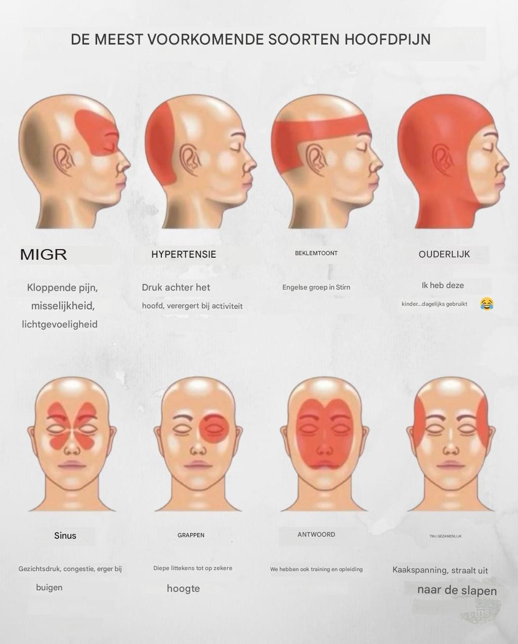 druk of strakheid Ook bekend als: Spanningshoofdpijn – Ouderlijke hoofdpijn Waar: Hele hoofd Voelt als: Gerelateerd aan vermoeidheid, doffe pijn Veroorzaakt door: Stress, gebrek aan slaap, mentale overbelasting – Sinushoofdpijn Waar: Voorhoofd, ogen, wangen Voelt als: Druk en gevoeligheid Andere tekenen: Verstopte neus, koorts – Clusterhoofdpijn Waar: Achter één oog of aan één kant Voelt als: Ondraaglijke, stekende pijn Andere tekenen: Waterige, verstopte neus, hangende oogleden