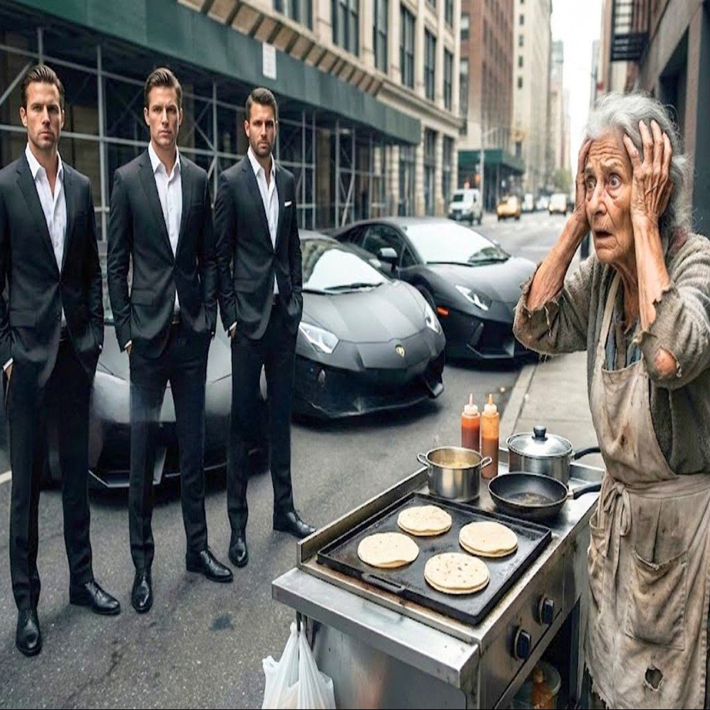 Arme oude vrouw geeft dakloze drieling te eten — jaren later stoppen er drie Lamborghini’s bij haar kraam…