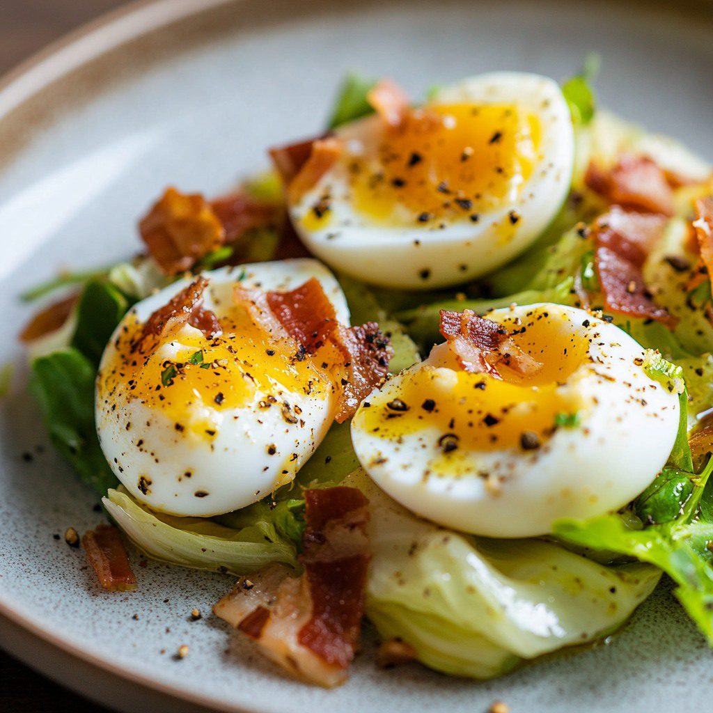 arme salade van gebakken witlof, spek en zachtgekookt ei