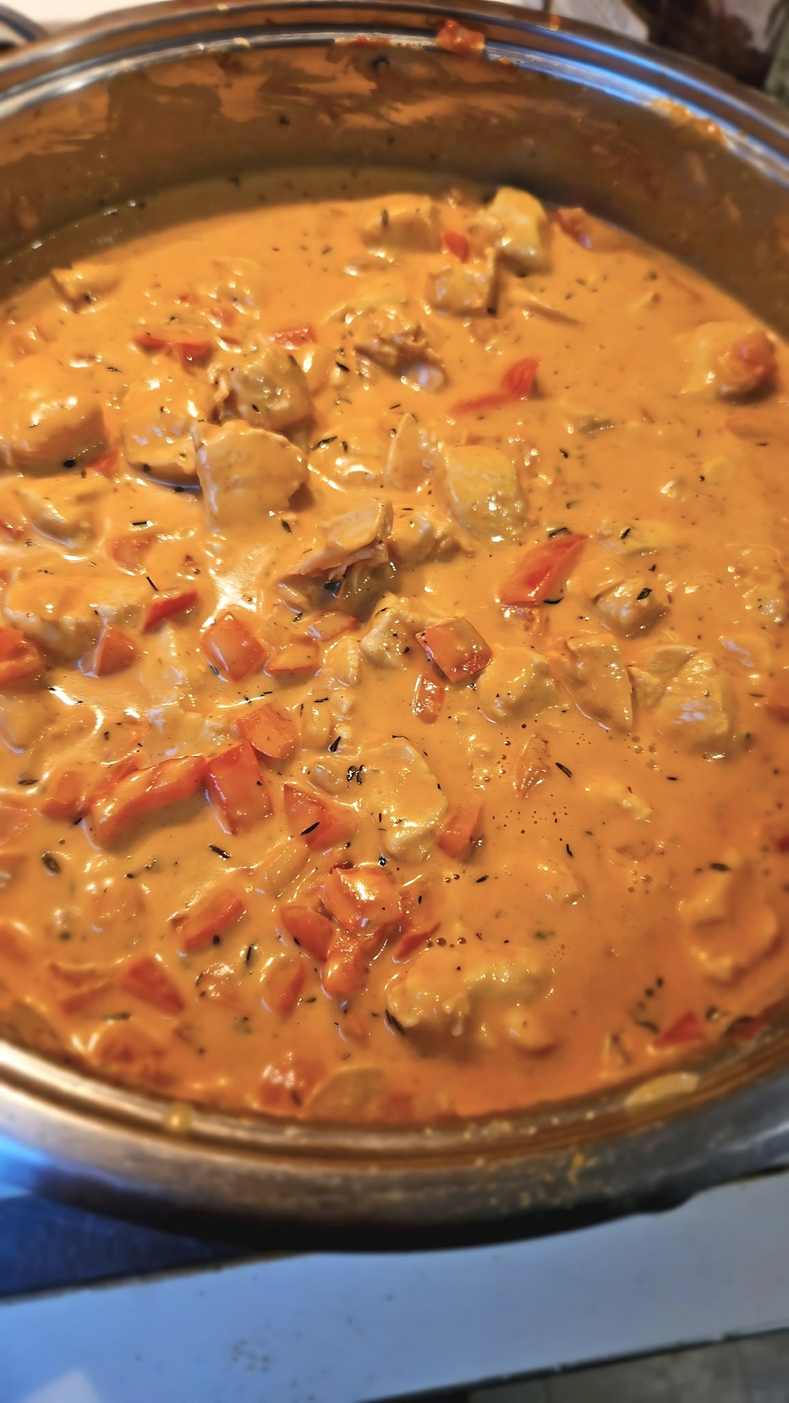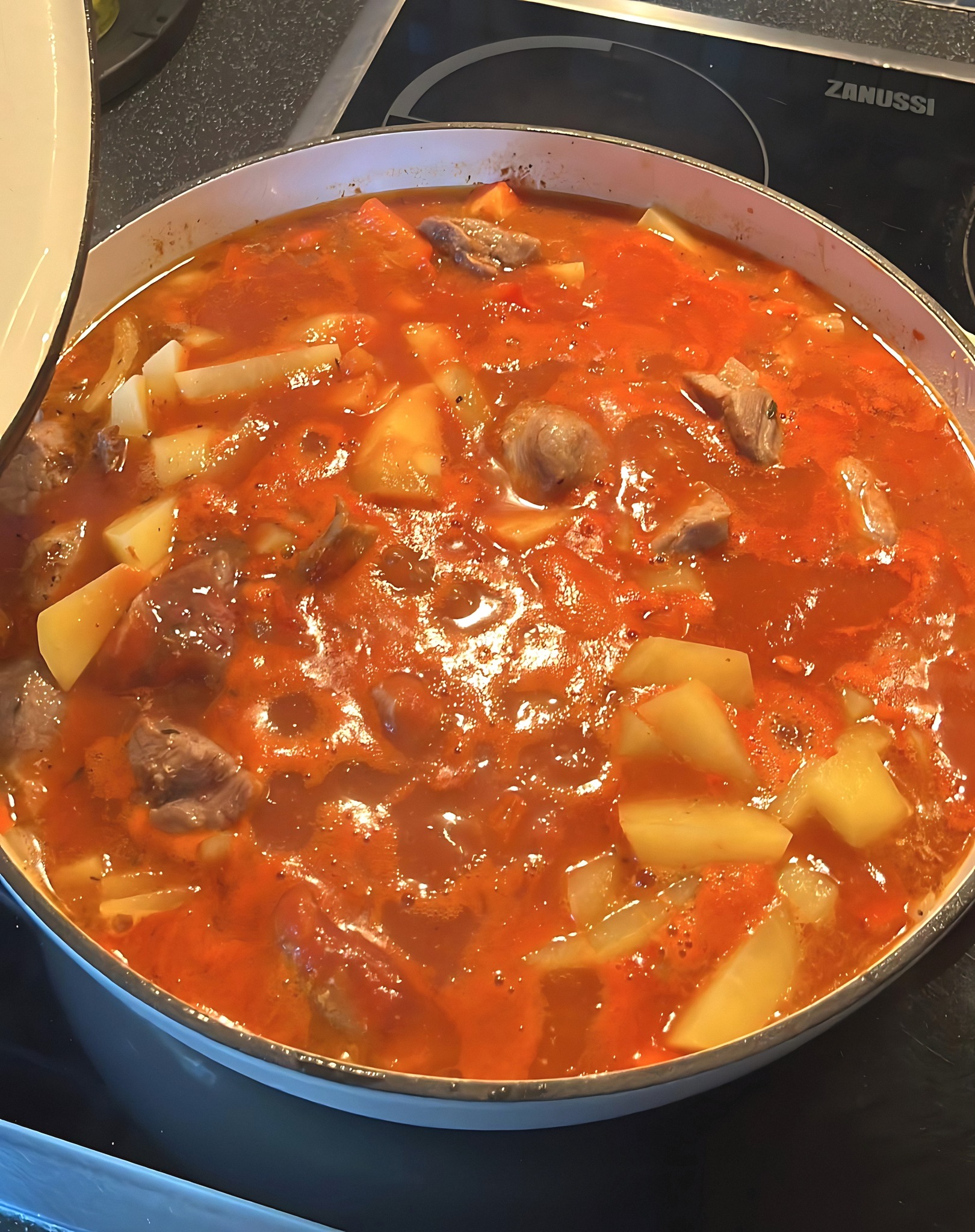 Recept voor Heerlijke Goulash 🩷 Benodigdheden 2 eetlepels zure room 2 takjes tijm 1 blaadje laurier 5 dl rundsbouillon 1 teentje knoflook 2 uien 1 rode paprika 1 blik (400 g) gepelde tomaten 4 aardappelen 750 g rundkarbonade (in blokjes) 1 eetlepel olijfolie Peper en zout Paprikapoeder Platte peterselie (voor garnering)