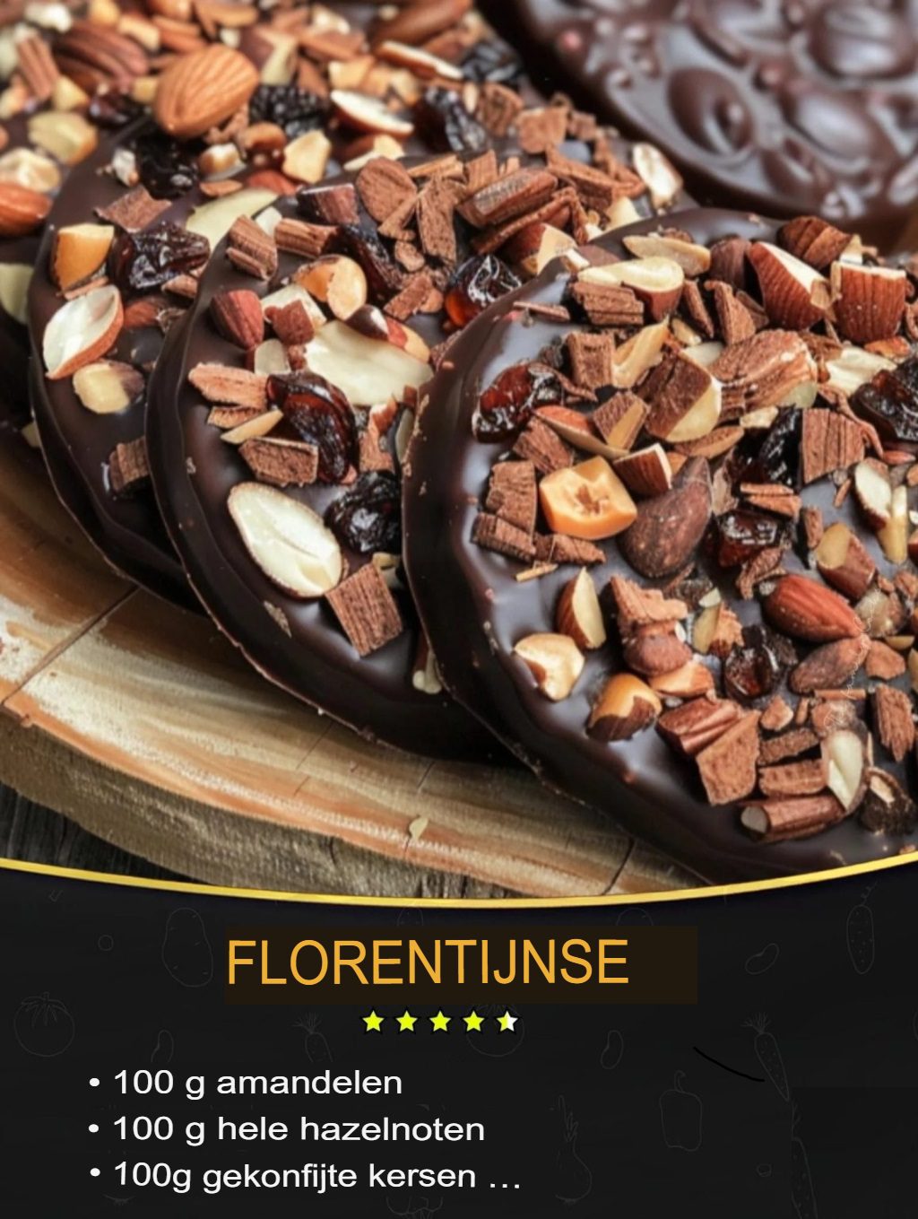 📋 Ingrediënten: 100 g amandelschaafsel 100 g hele hazelnoten 100 g gekonfijte kersen, in stukjes gesneden 100 g suiker 100 g boter 50 g honing 50 g bloem 100 g pure chocolade, voor de afwerking 🥣 Instructies: Voorverwarmen: