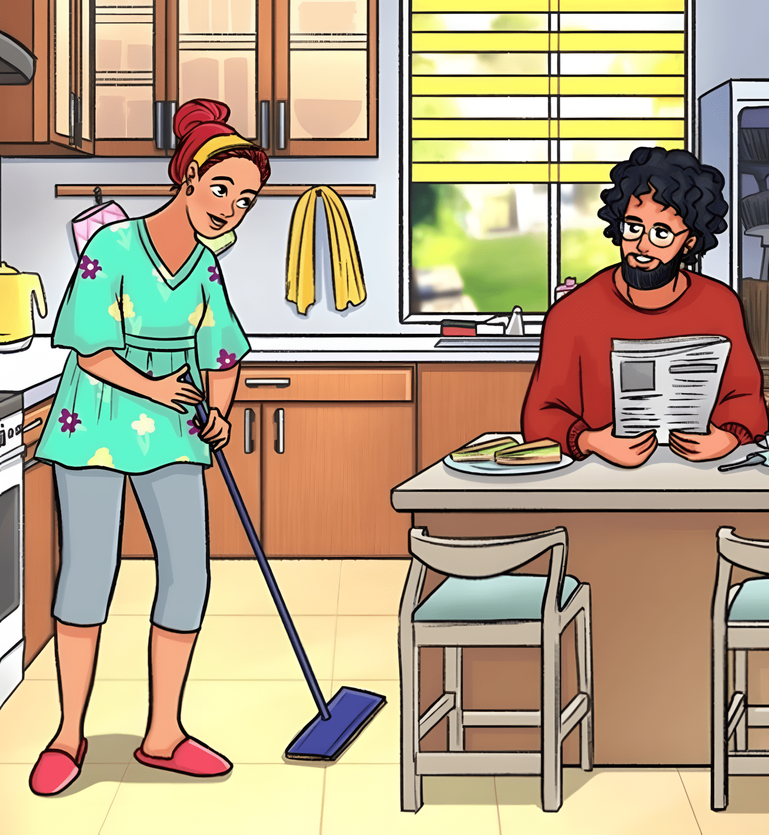 Een doodgewone keuken vol rust en routine: een man verdiept in zijn krant, een vrouw die krachtig het aanrecht schrobt. Alles oogt vertrouwd, netjes en overzichtelijk. De sfeer is bijna meditatief in zijn huiselijkheid en eenvoud.