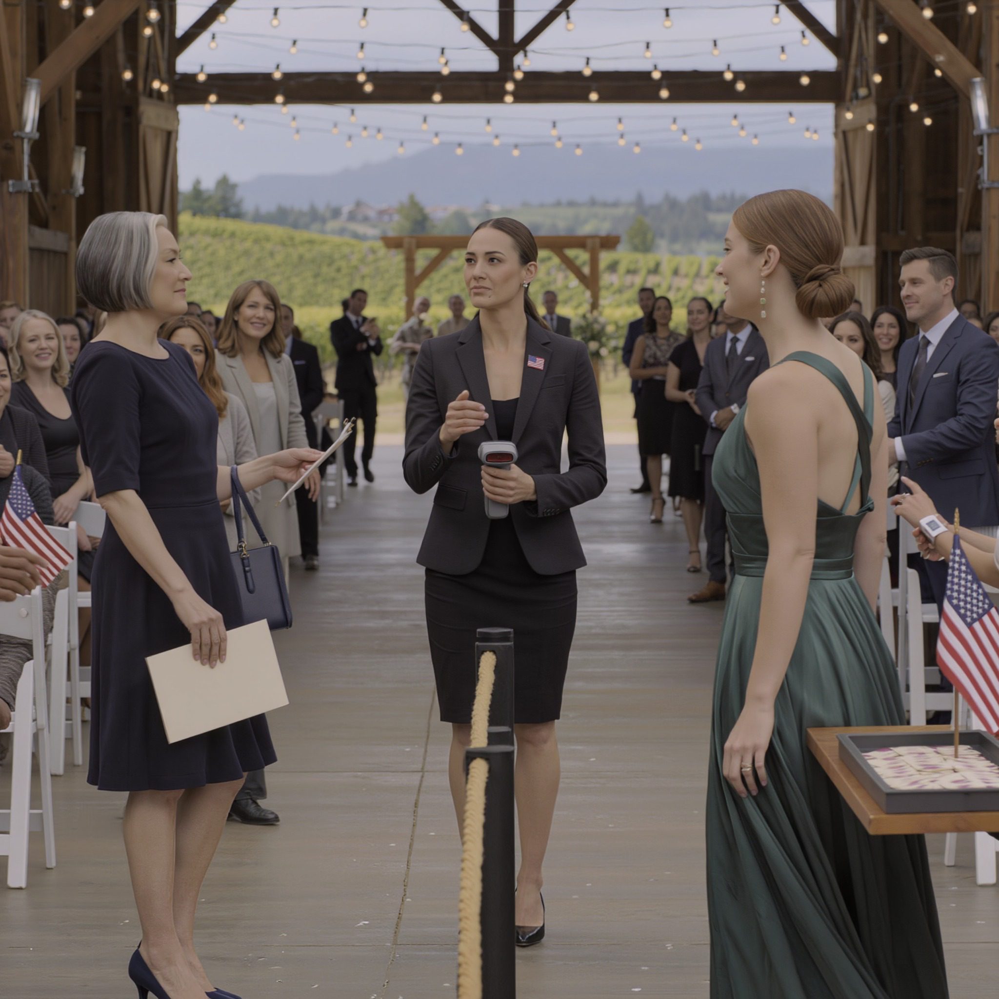 De trouwlocatie was een van die verbouwde schuren die de laatste jaren zo populair waren geworden – met zichtbare balken en lichtslingers, rustieke charme gecombineerd met moderne gemakken. Het lag op een heuvel buiten Portland, Oregon, met uitzicht op wijngaarden die zich uitstrekten tot aan de bergen. Ik stond in de rij bij de ingang met ongeveer veertig andere bruiloftsgasten, te wachten tot onze uitnodigingen gecontroleerd waren voordat we de ceremonieruimte mochten betreden.