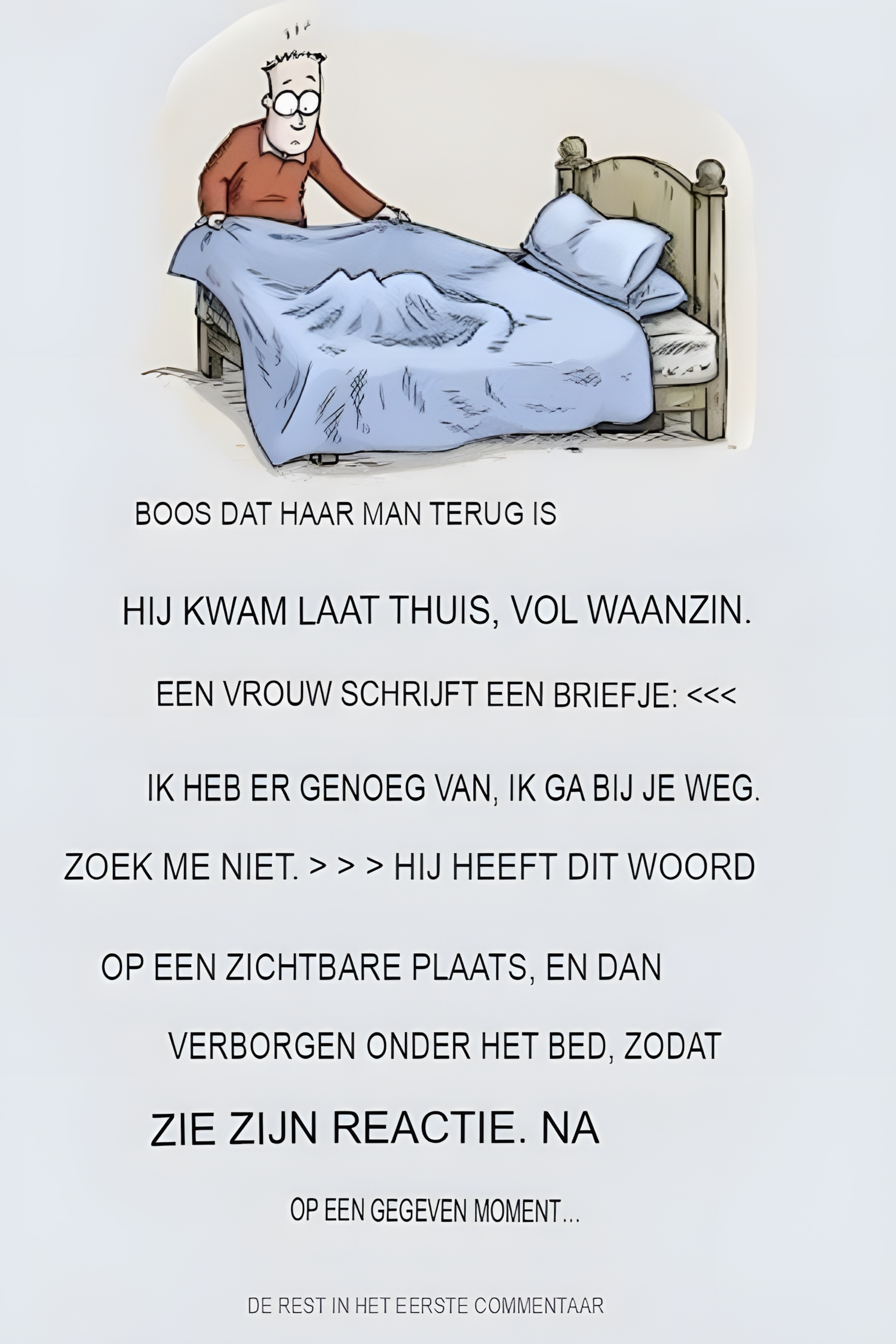 Vervolgens verstopt ze zich onder het bed, nieuwsgierig naar de reactie van haar man als ze het nieuws hoort.