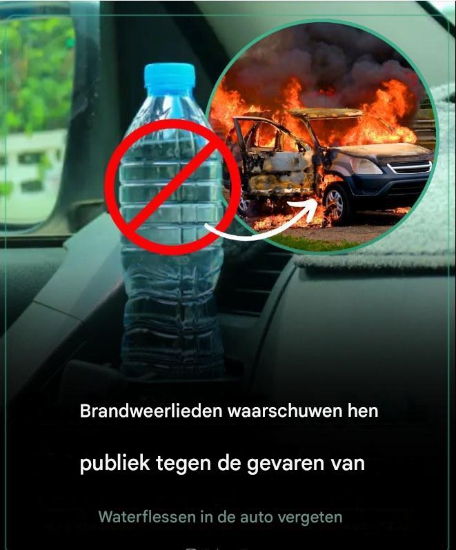 daadwerkelijke incidenten Er zijn verschillende gedocumenteerde incidenten waarbij waterflessen branden in auto’s hebben veroorzaakt. Zo ontdekte een werknemer van een nutsbedrijf in Idaho in 2017 dat er rook in de stoel van zijn vrachtwagen zat, nadat hij er een fles water op had gezet. Door de fles viel er zonlicht op de stoelbekleding, waardoor deze warm werd en begon te branden. Er zijn andere meldingen van soortgelijke incidenten waarbij flessen water die in hete auto’s waren achtergelaten, betrokken raakten bij branden of in de buurt van branden kwamen.