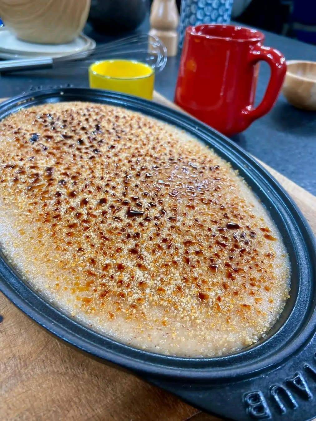 Ingrediënten Voor de crème: 100 g fijn griesmeel 500 ml volle melk 200 ml slagroom 100 g suiker 1 vanillestokje (of 1 theelepel vanille-extract) 4 eierdooiers Een snufje zout Voor karamellisatie: 50 g bruine suiker (of witte suiker) Optioneel: een beetje water om het karameliseren te vergemakkelijken Keukengerei