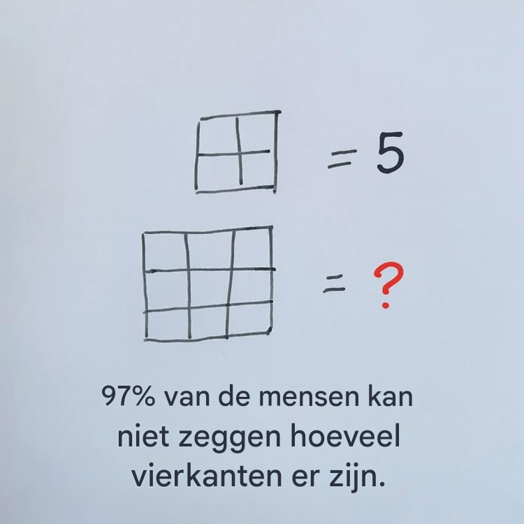Het probleem lijkt op een puzzel : je begint enthousiast en ontdekt dan dat er verschillende niveaus zijn. Het 3×3-raster bevat bijvoorbeeld niet alleen kleine, gemakkelijk zichtbare vierkanten. Het bevat ook subtiele combinaties : middelgrote vierkanten bestaande uit 2×2 vakjes, en een groot vierkant dat het geheel omvat. Als je deze groeperingen niet in acht neemt, mis je de helft van het verhaal. Het goede nieuws is: er is een simpele methode om alles te tellen zonder iets te vergeten.