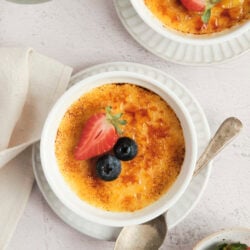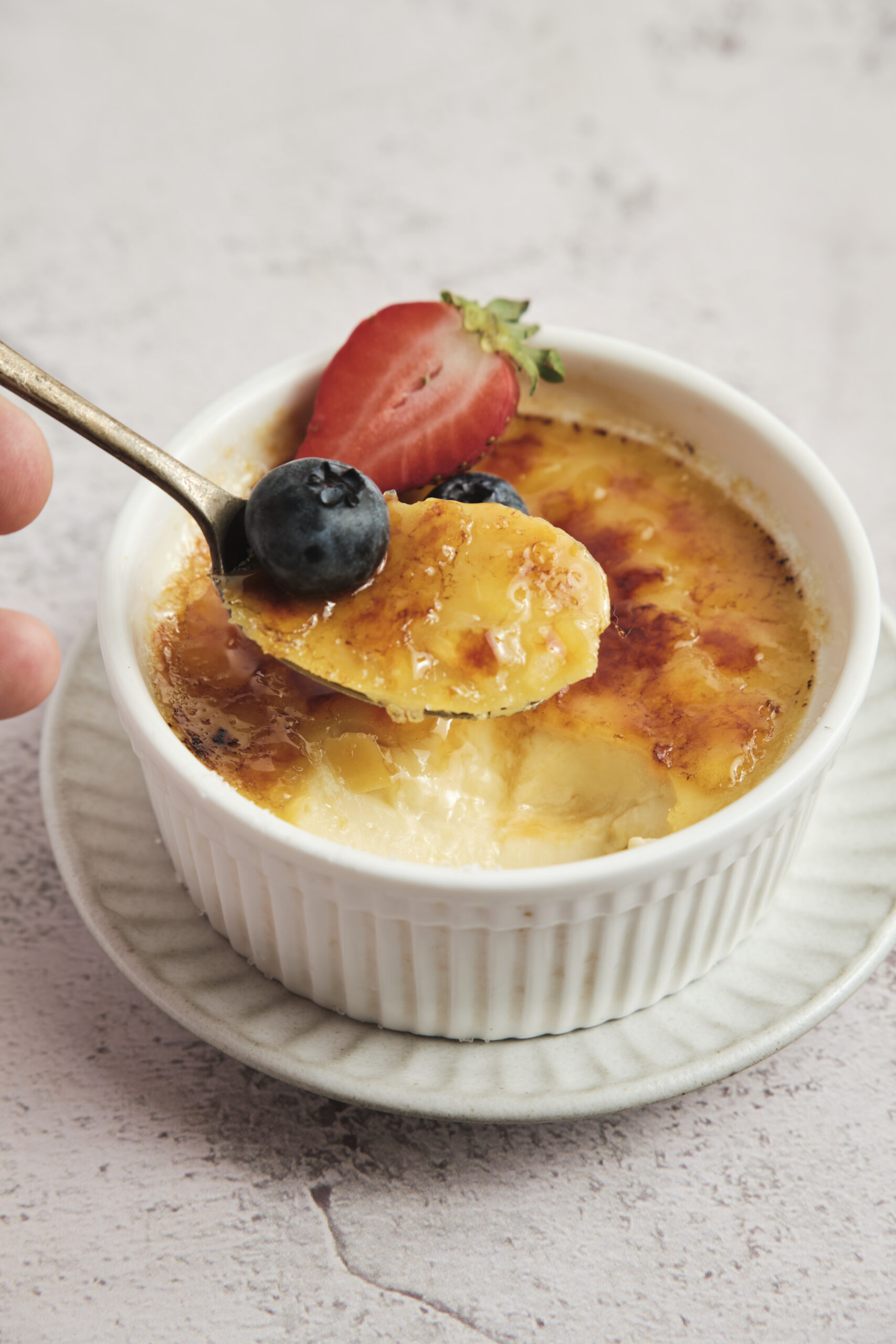 Serveer de crème brûlée met een paar verse rode bessen voor een kleurrijke en smaakvolle presentatie. Je kunt hem ook garneren met zelfgemaakte gezoete slagroom . Of, hij is gewoon heerlijk op zichzelf. Crème brûlée is een bijzonder smakelijk dessert om een maaltijd met Franse invloeden mee af te sluiten. Bijvoorbeeld een beef bourguignon met een frisse groene salade met champagnevinaigrette . Serveer het met een warm stokbrood en sluit je maaltijd in stijl af met dit heerlijke dessert. Je waant je in het paradijs… of in Parijs.