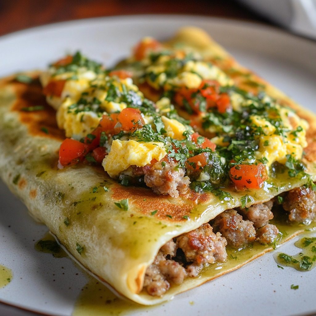 Crêpe gevuld met worst, roerei en salsa verde