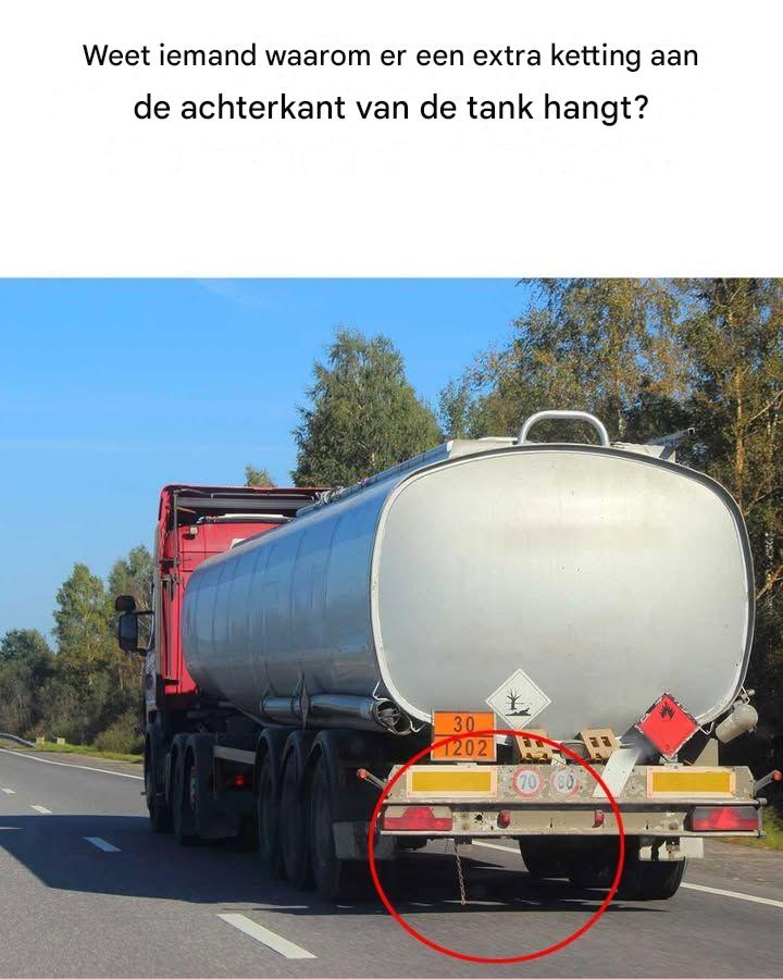 De extra ketting die aan de achterkant van de tank hangt, dient als aardingsvoorziening. Het belangrijkste doel ervan is het afvoeren van statische elektriciteit die kan ontstaan ​​tijdens het transport van brandbare vloeistoffen. Als de vrachtwagen rijdt, kan er door de wrijving tussen de vloeistof en de tank, en door de beweging van de vrachtwagen zelf, statische elektriciteit ontstaan. Als deze statische lading niet goed wordt beheerd, kunnen er vonken ontstaan ​​die een groot risico vormen op het ontsteken van de brandbare lading. De ketting sleept over de grond en zorgt ervoor dat statische elektriciteit veilig naar de grond wordt afgevoerd. Zo wordt het risico op brand of een explosie verminderd.