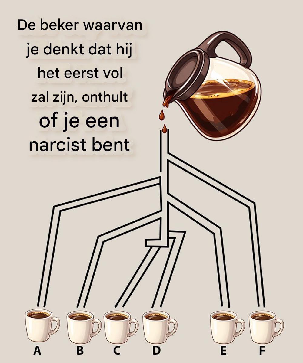 Op het eerste gezicht lijkt deze afbeelding een simpele logische puzzel. Koffie stroomt door een netwerk van leidingen naar zes kopjes, aangeduid met de letters A tot en met F. De uitdaging lijkt eenvoudig: welk kopje zal het eerst vol zijn?