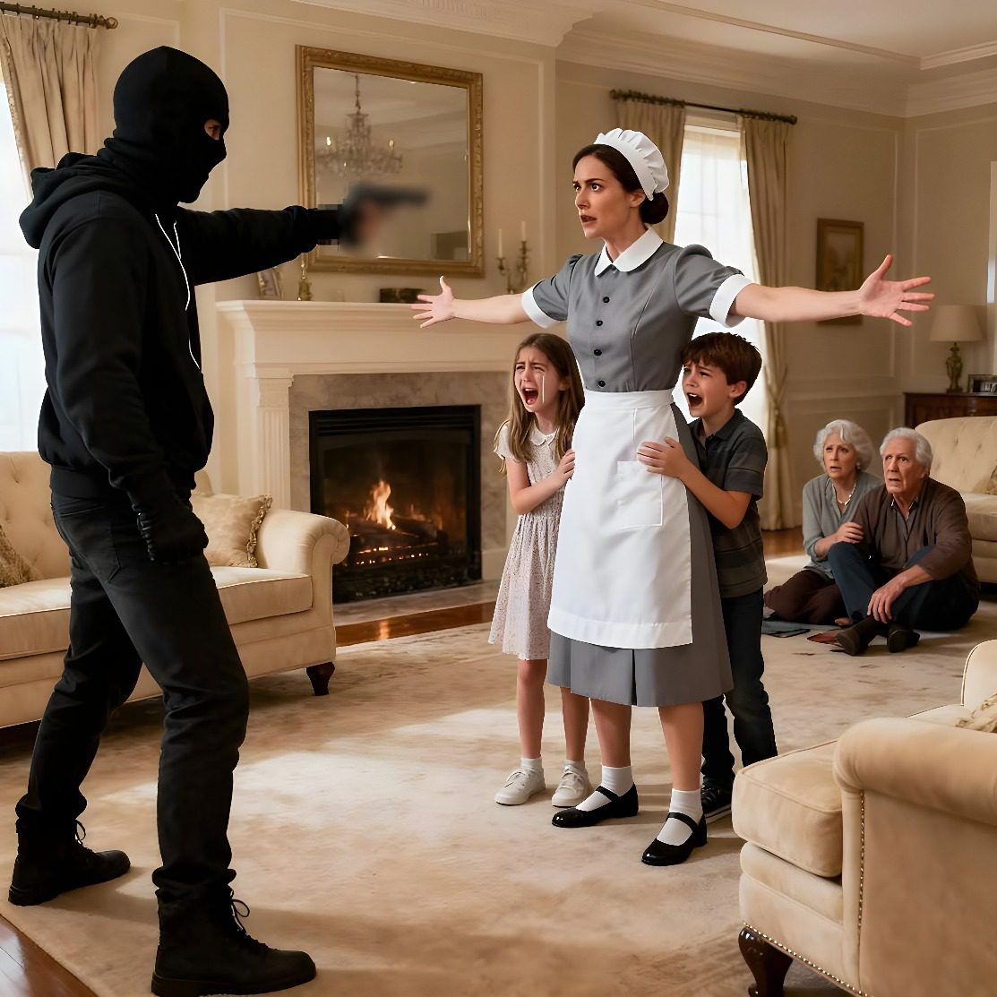 De kinderen huilden, de mannen in het pak doken op de grond met hun handen boven hun hoofd. ‘Iedereen beneden!’, brulde een van de gemaskerde dieven, terwijl hij zijn pistool opstak. Zijn stem klonk gutturaal en scherp.
