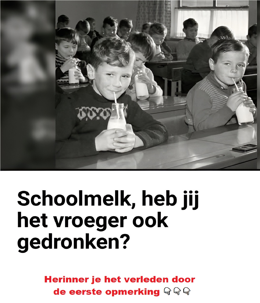 De schoolbel luidt en de kinderen haasten zich naar hun plaatsen. Het klaslokaal is gevuld met het geluid van schuivende stoelen en zacht gefluister. Op het bureau van de juf staan kratten met glazen flesjes melk, afgesloten met zilverkleurige dopjes. De geur van verse melk hangt in de lucht.