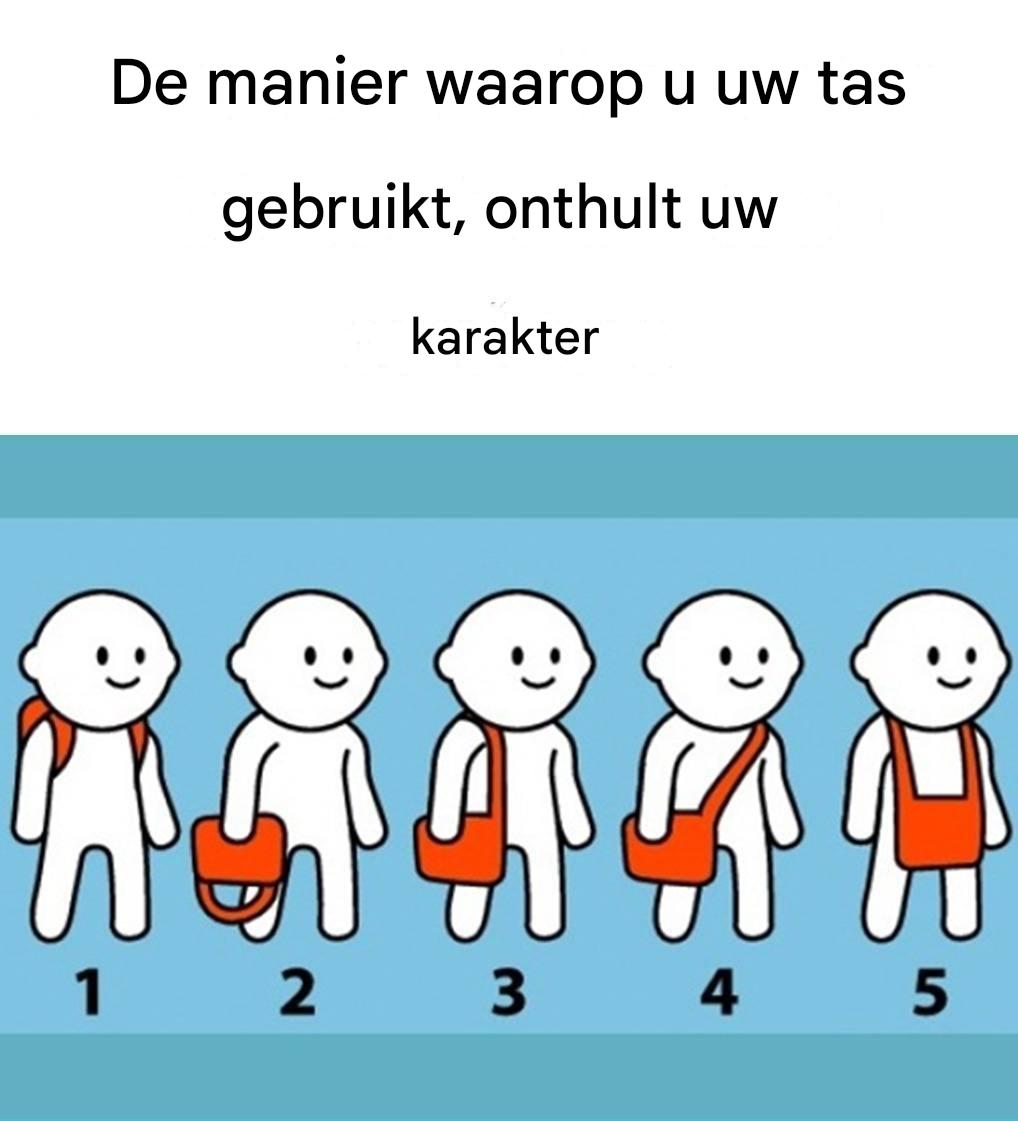 Draag jij je tas liever in je hand? Dan ben je waarschijnlijk iemand die graag alles onder controle houdt. Je bent georganiseerd, doelgericht en nuchter, en laat weinig aan het toeval over. Je houdt ervan om overzicht te bewaren en laat duidelijk merken wat je grenzen en verwachtingen zijn. Hoewel je soms afstandelijk kan overkomen, ben je eigenlijk een zeer betrouwbare en loyale persoonlijkheid waarop mensen kunnen bouwen.
