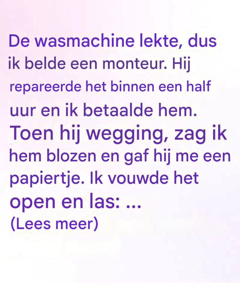 Het begon met iets zo gewoons dat ik er nauwelijks bij stilstond: mijn wasmachine begon te lekken. Geïrriteerd maar pragmatisch belde ik een reparatieservice. Een jonge monteur kwam langs, repareerde het probleem in een mum van tijd en pakte zijn gereedschap in. Ik bedankte hem, betaalde en begeleidde hem naar de deur.
