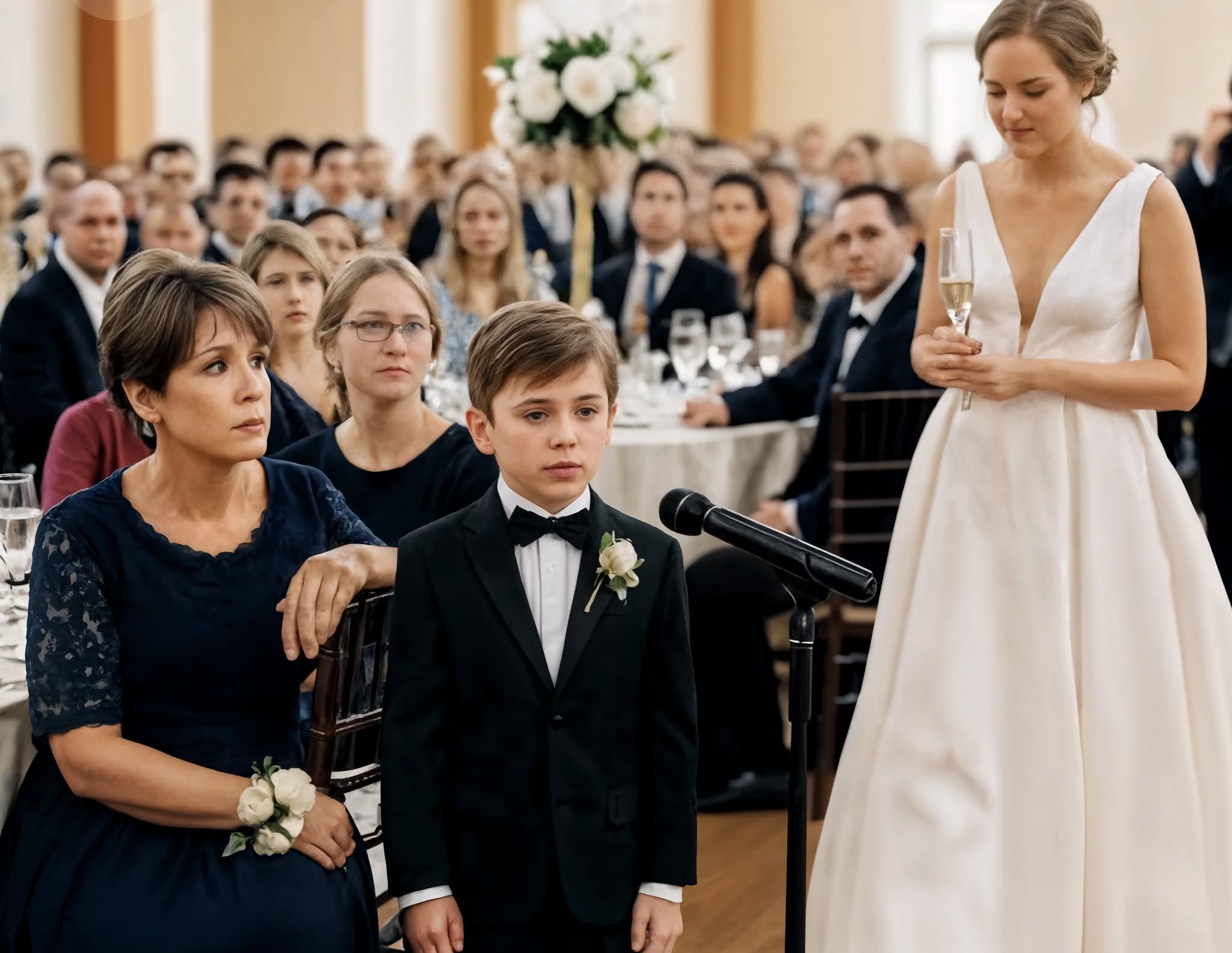 Noah zag er schattig uit in zijn mini-smoking en nam zijn rol zeer serieus terwijl hij de trouwringen droeg. Ik droeg een eenvoudige donkerblauwe jurk – niets opvallends, gewoon klassiek. Het was de favoriete jurk van mijn overleden echtgenoot, wat het extra bijzonder maakte.