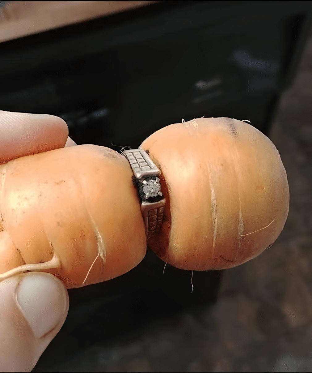 Hoe is dat mogelijk? Een klein worteltje moest door het midden van een ring groeien die al meer dan tien jaar in de grond begraven lag. Terwijl de groente groeide, vulde deze de ring perfect en het sieraad stopte precies bij de wortel, alsof het er altijd al deel van uitmaakte.