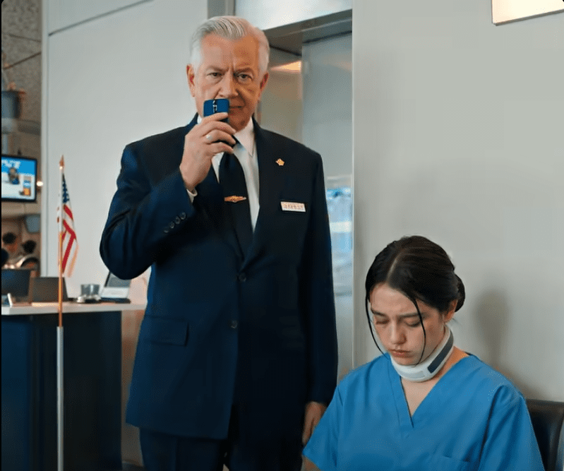 Maandagochtend, gate A47 op Dallas-Fort Worth International. De terminal bruiste van de vermoeide energie van vroege reizigers: zakenmensen die koffie vasthielden alsof het hun redding was, gezinnen die slaperige kinderen naar de veiligheidscontrole begeleidden, het constante gezoem van vertrekaankondigingen dat door de gangen galmde. Mensen bewogen zich doelgericht voort, hun bestemming in gedachten, zich niet bewust van de vrouw in blauwe verpleegsterskleding die was gestopt met ademen op het moment dat ze ging zitten.