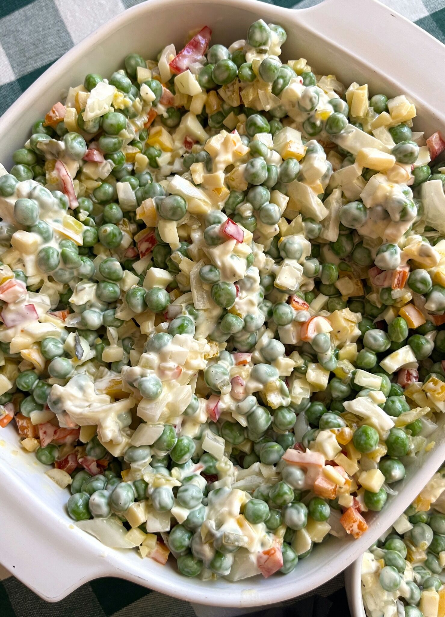 Deze levendige en smaakvolle Dublin Pea Salad is een verfrissend bijgerecht vol doperwten, knapperige paprika’s, hardgekookte eieren en pittige Ierse kaas, gemengd in een romige en pittige dressing met een vleugje kruiden en specerijen.