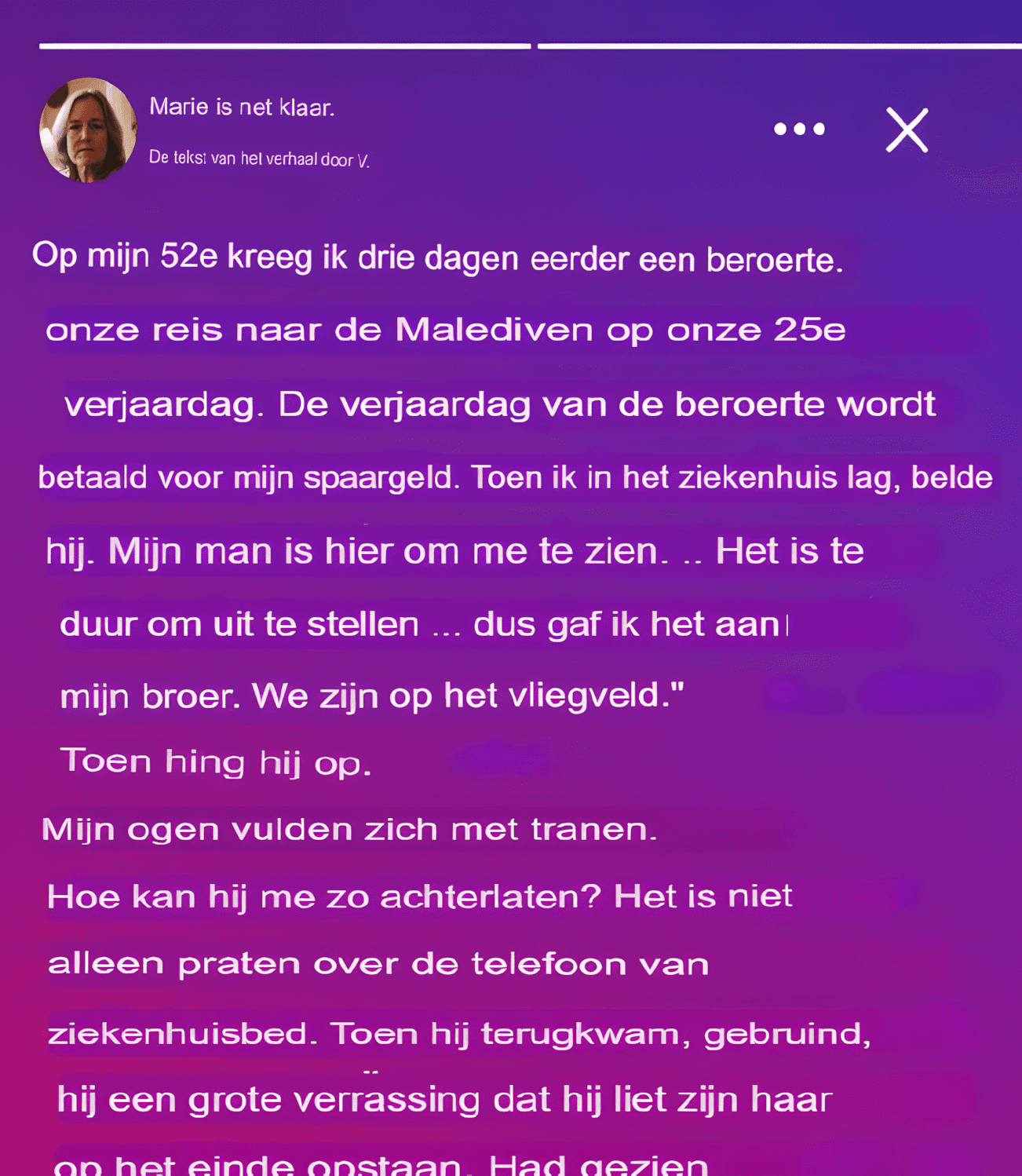Drie dagen voor onze droomreis naar de Malediven, ter ere van onze trouwdag, kreeg ik een beroerte. Terwijl ik in het ziekenhuis lag, niet in staat om te bewegen, belde mijn man… vanaf het vliegveld. « Het is te duur om een nieuwe afspraak te maken, » zei hij, en hing op. Dat telefoontje veranderde alles en zette een plan in gang dat hij niet had verwacht.