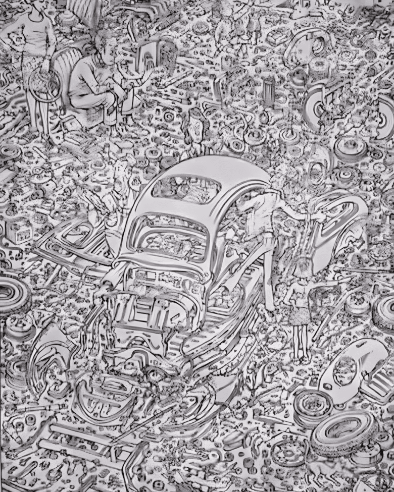 Op het eerste gezicht lijkt deze illustratie een simpele mengelmoes van auto-onderdelen, wielen en mechanische componenten. Maar als je de tijd neemt om goed te kijken, zie je zes slim gecamoufleerde figuren en een kat. De setting van een autokerkhof dient als decor voor deze visuele puzzel, waarin elk onderdeel zijn eigen rol speelt.