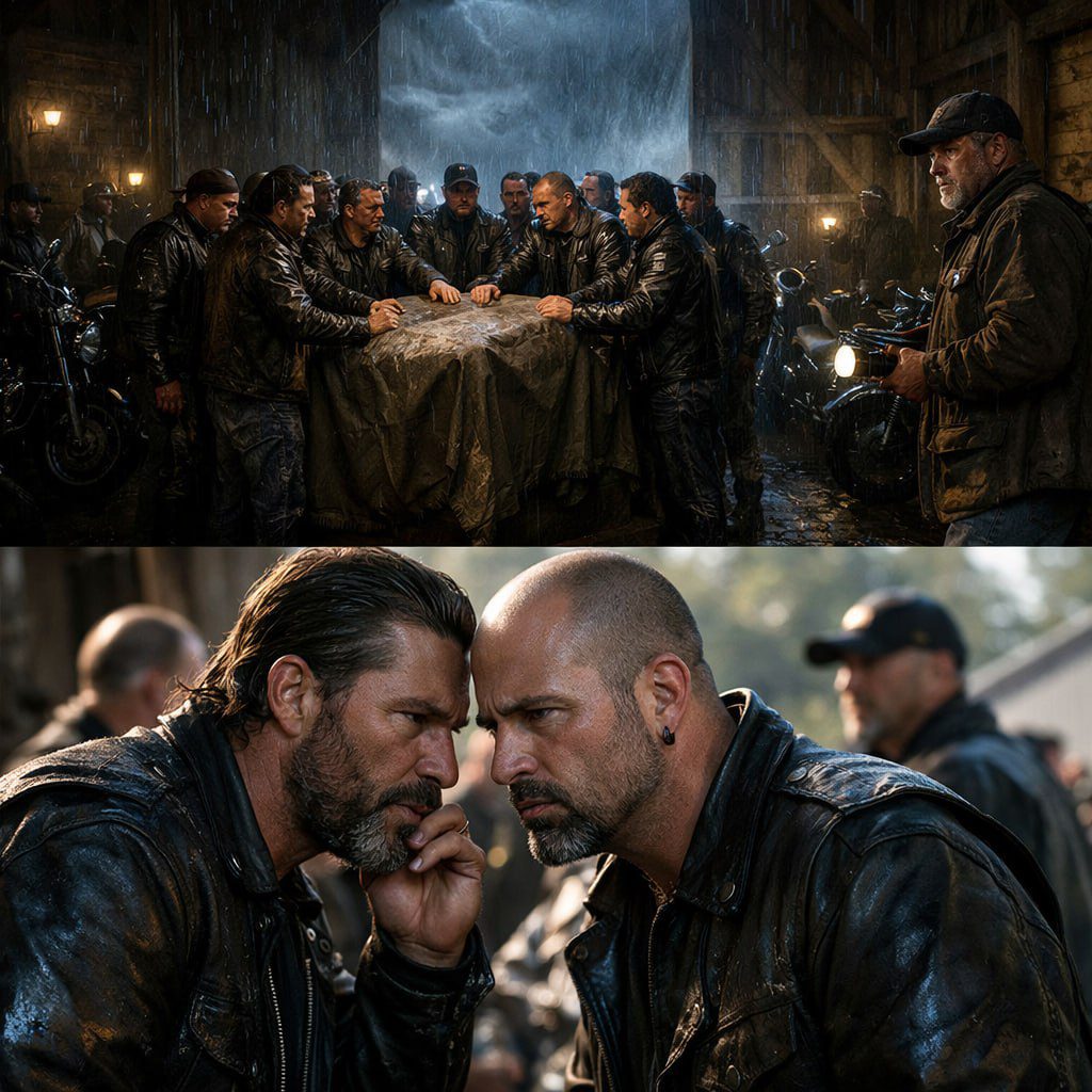 Een kolossale man met grijze slapen en armen als boomstammen naderde de veranda. Zijn leren vest was bezaaid met patches die Tom in het schemerlicht niet goed kon onderscheiden, maar de houding van de man verraadde dat hij de leiding had. « Meneer, ik ben Wade Collins, » riep de man boven de opkomende wind uit. « We hebben hier vijftig motorrijders en die storm gaat zo losbreken. Zou het mogelijk zijn om in uw schuur te schuilen? We vergoeden het ongemak. » Tom keek langs Wade heen naar de zee van motoren en motorrijders.