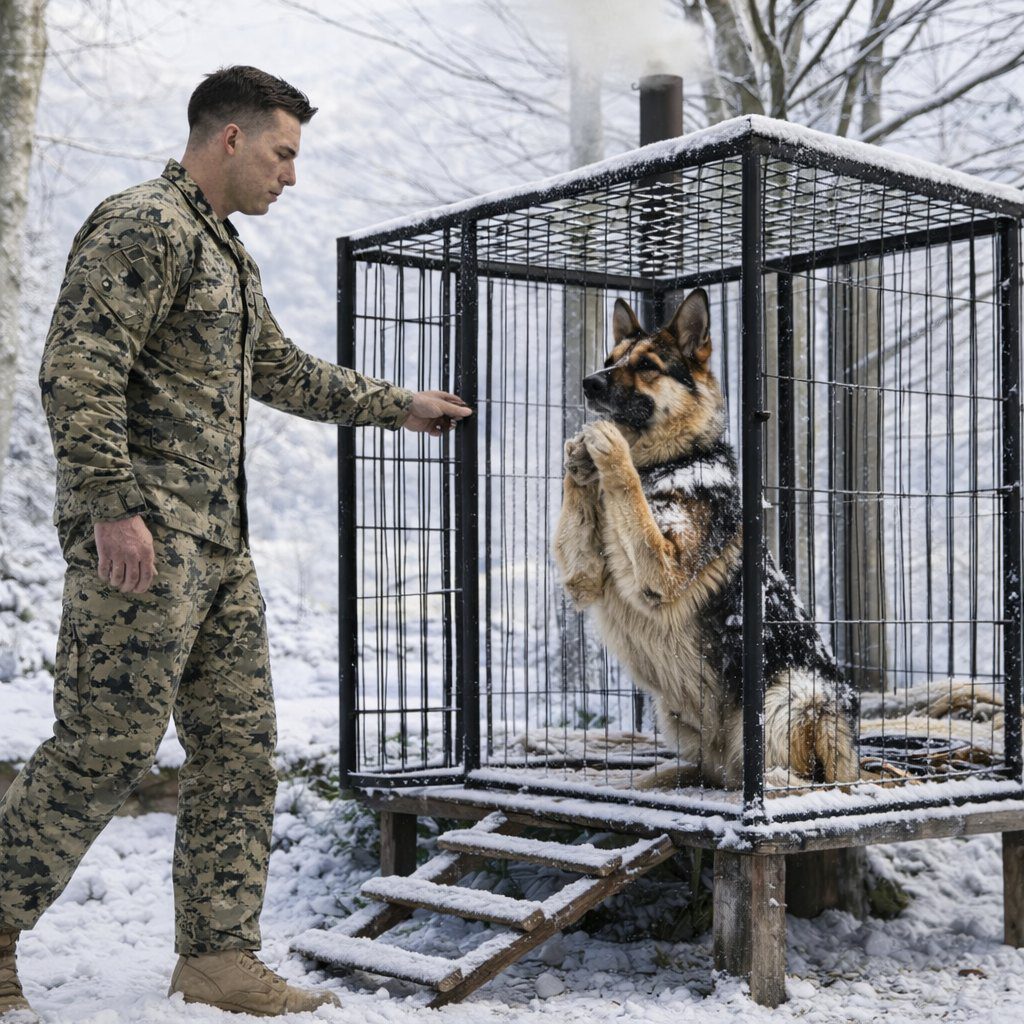 Een Duitse herder werd in een stalen kooi achtergelaten om te bevriezen — een Navy SEAL redde het hele bos.