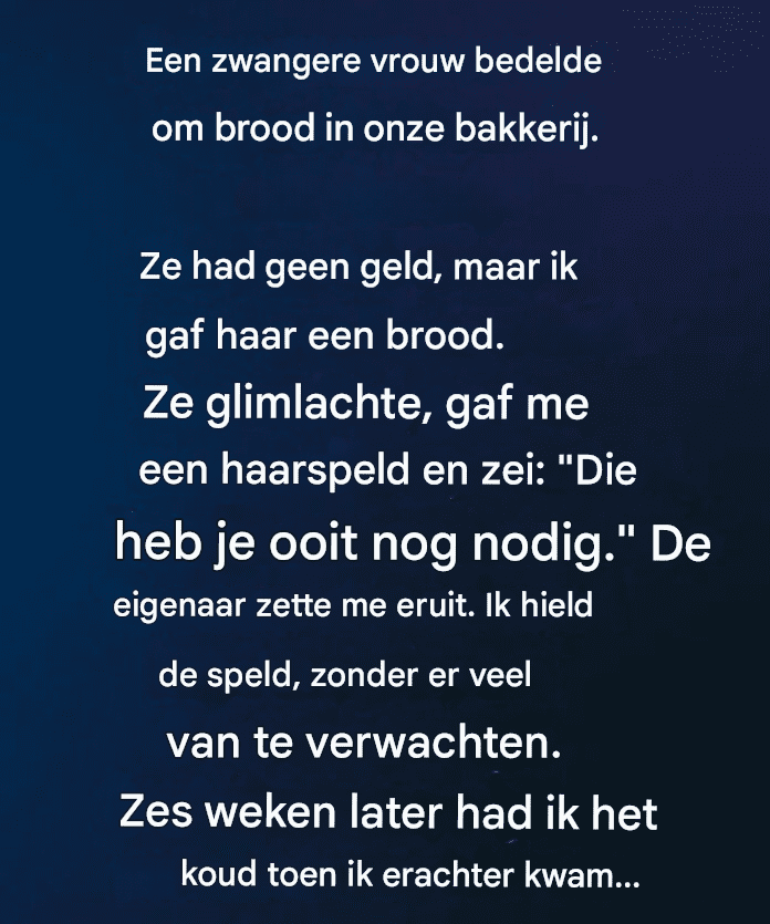 Ik vertrok met niets anders dan mijn schort, de vage geur van meel die er nog aan hing, en het kleine haarspeldje dat de vrouw me had gegeven. Ik wist niet waarom ik het bewaarde – misschien omdat het me eraan herinnerde dat vriendelijkheid, zelfs als het ons iets kost, nooit helemaal verspild wordt.