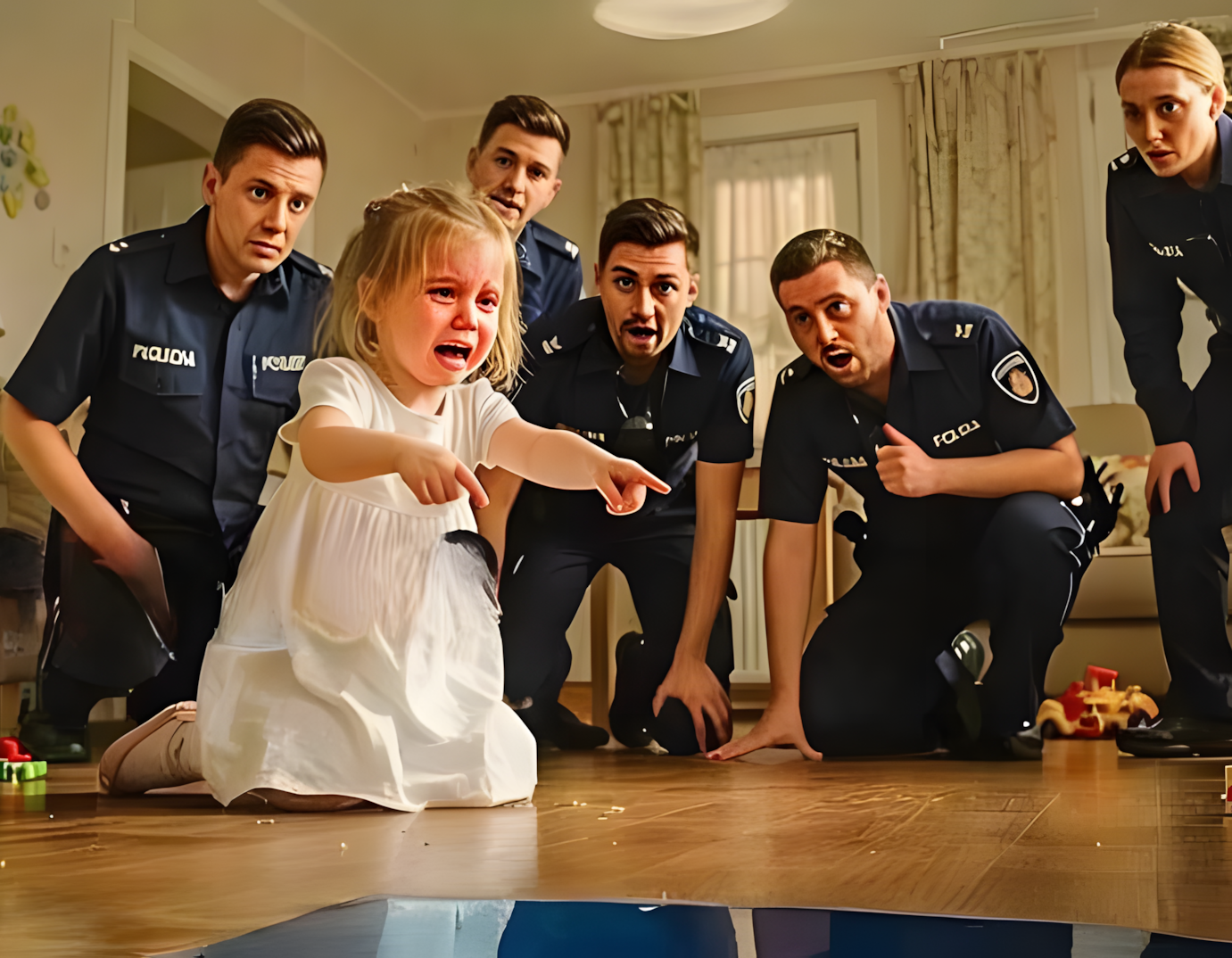 Een van de agenten ging op zijn knieën en keek onder het bed. Het was leeg — stof, een paar gevallen speelgoedjes, niets verdachts.