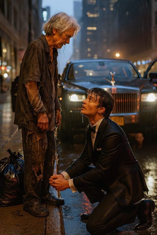 Maar op dat moment kwam een rijke man in een mooie, dure auto naar de vrouw toe die op straat stond. Hij stapte snel uit en toen hij de vrouw in die staat zag, doorweekt en alleen, probeerde hij haar te helpen.