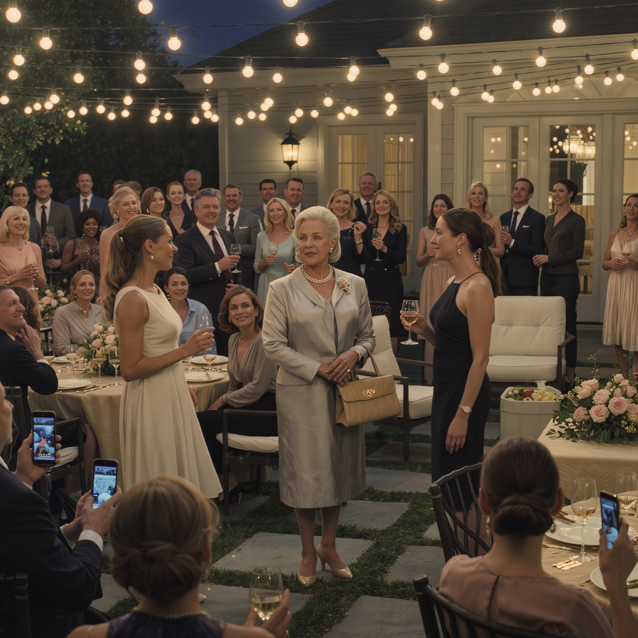 Eleanor Thompson had al vaker nare dingen gehoord, maar nog nooit zoiets. Niet in een achtertuin die baadt in het licht van een café, niet voor meer dan vijftig keurig geklede gasten die wijnglazen in de hand hielden en beleefde glimlachen uitstraalden, en al helemaal niet met telefoons in de hand om het moment vast te leggen alsof het feestvermaak was.