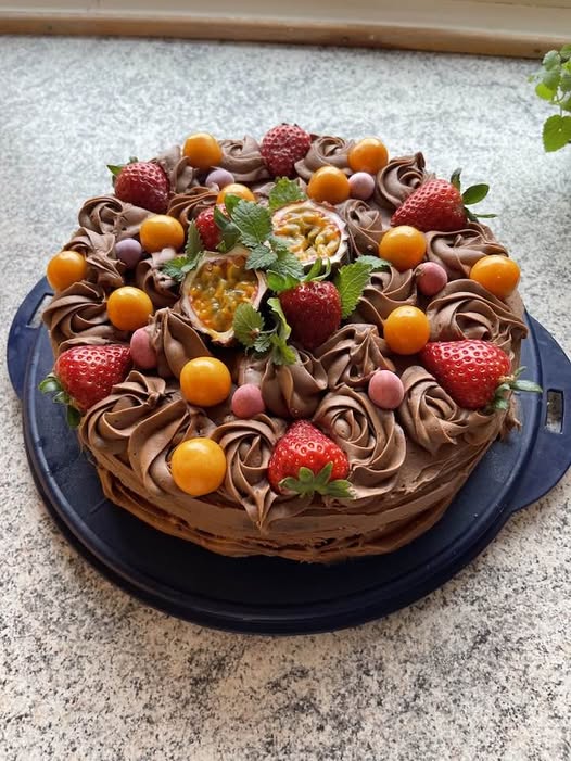 Deze chokoladetaart is een waar meesterwerk dat zowel elegantie als onweerstaanbaarheid uitstraalt. Met een rijke chocoladesmaak, vers fruit en decoratieve details is deze taart perfect voor verjaardagen, feesten of als een luxe dessert. Laat je verleiden door deze heerlijke creatie die elke gelegenheid speciaal maakt.