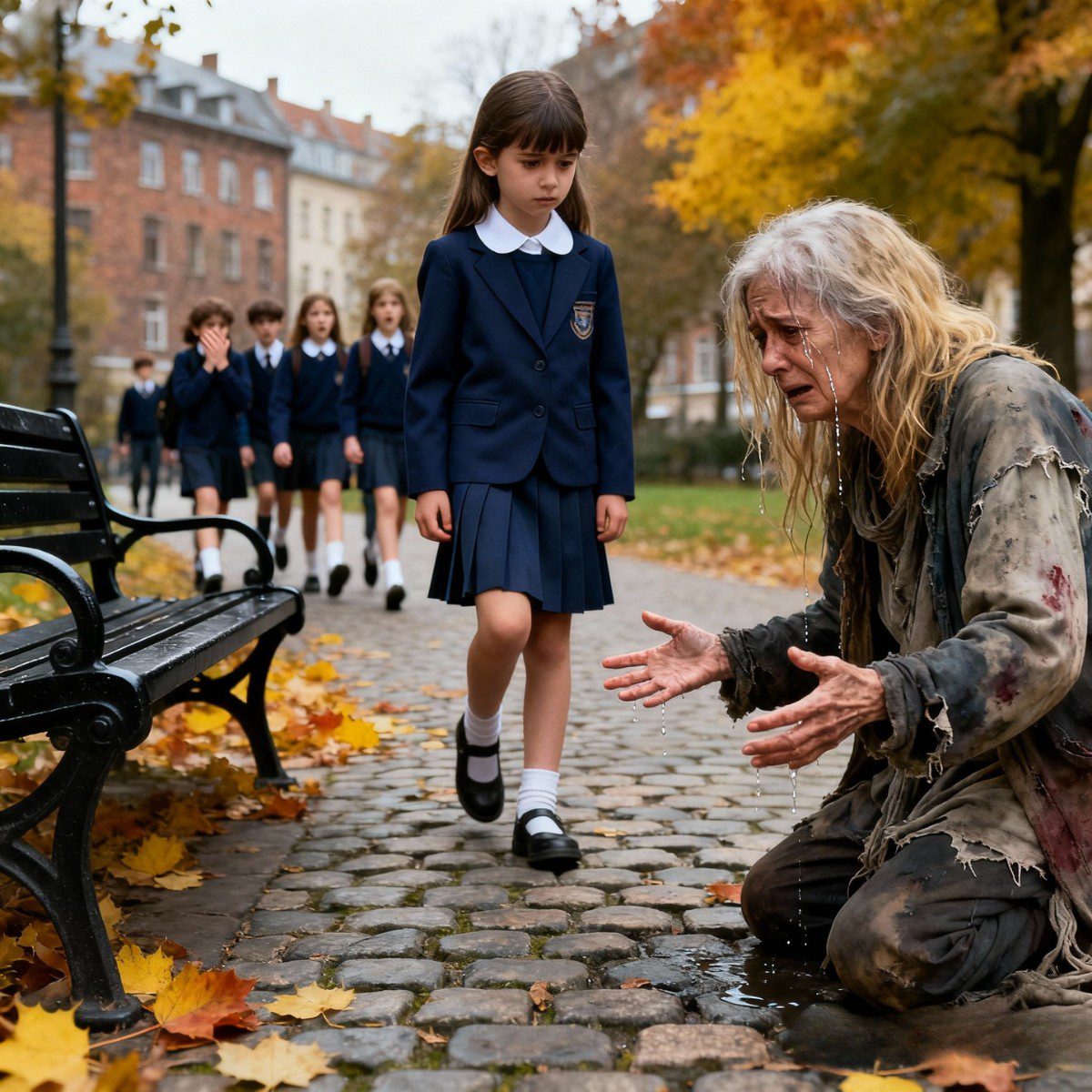 Elke middag na school liep de veertienjarige Clara Carter met haar twee beste vriendinnen, Mia Thompson en Jordan Ellis , door de kleine buitenwijk Brookridge in Ohio naar huis . Hun route leidde hen altijd langs Maple Park , waar een dakloze vrouw, gehuld in meerdere lagen jassen, op een hoekbankje zat. Haar warrige bruine haar en vermoeide ogen deden haar ouder lijken dan ze werkelijk was.