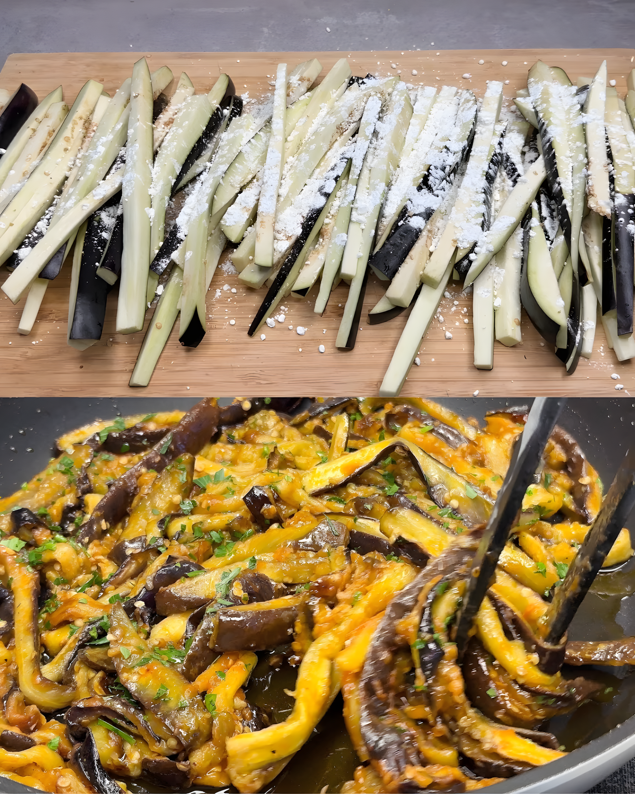Snijd de aubergines in dunne repen.