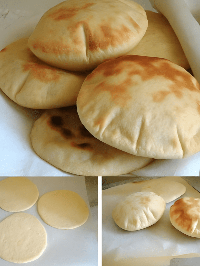 4. Vormen van pitabrood 🍪: Verdeel het deeg in 8 gelijke stukken. Rol elk stuk uit tot een cirkel van ongeveer 1 cm dik. Laat ze nog 10 minuten rusten.