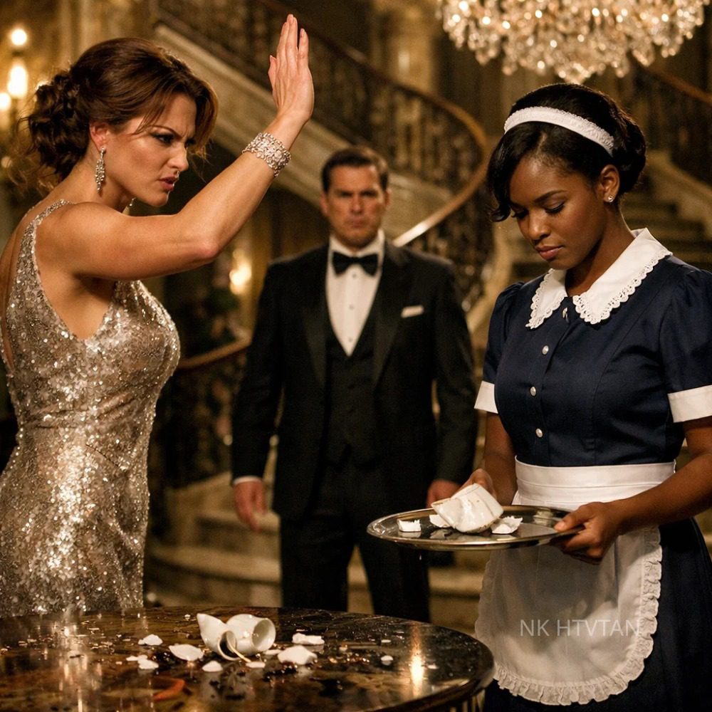 Olivia Hughes, de nieuwe vrouw van de miljardair, stond daar in een glinsterende blauwe jurk, haar ogen vurig, haar hand nog steeds tegen de wang van een jonge dienstmeid in een keurig blauw-wit uniform gedrukt. De dienstmeid – Aisha Daniels – trok een grimas, maar bleef staan.
