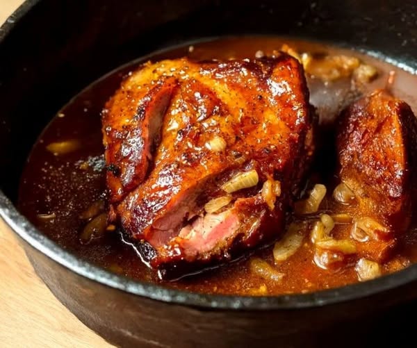 Gekonfijte varkensschenkel in knoflook-uiensaus: een rustieke, malse en gegarandeerd succesvolle stoofpot!