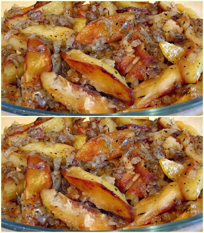 Deze geroosterde aardappelen met een saus van gekarameliseerde uien zijn een heerlijk bijgerecht