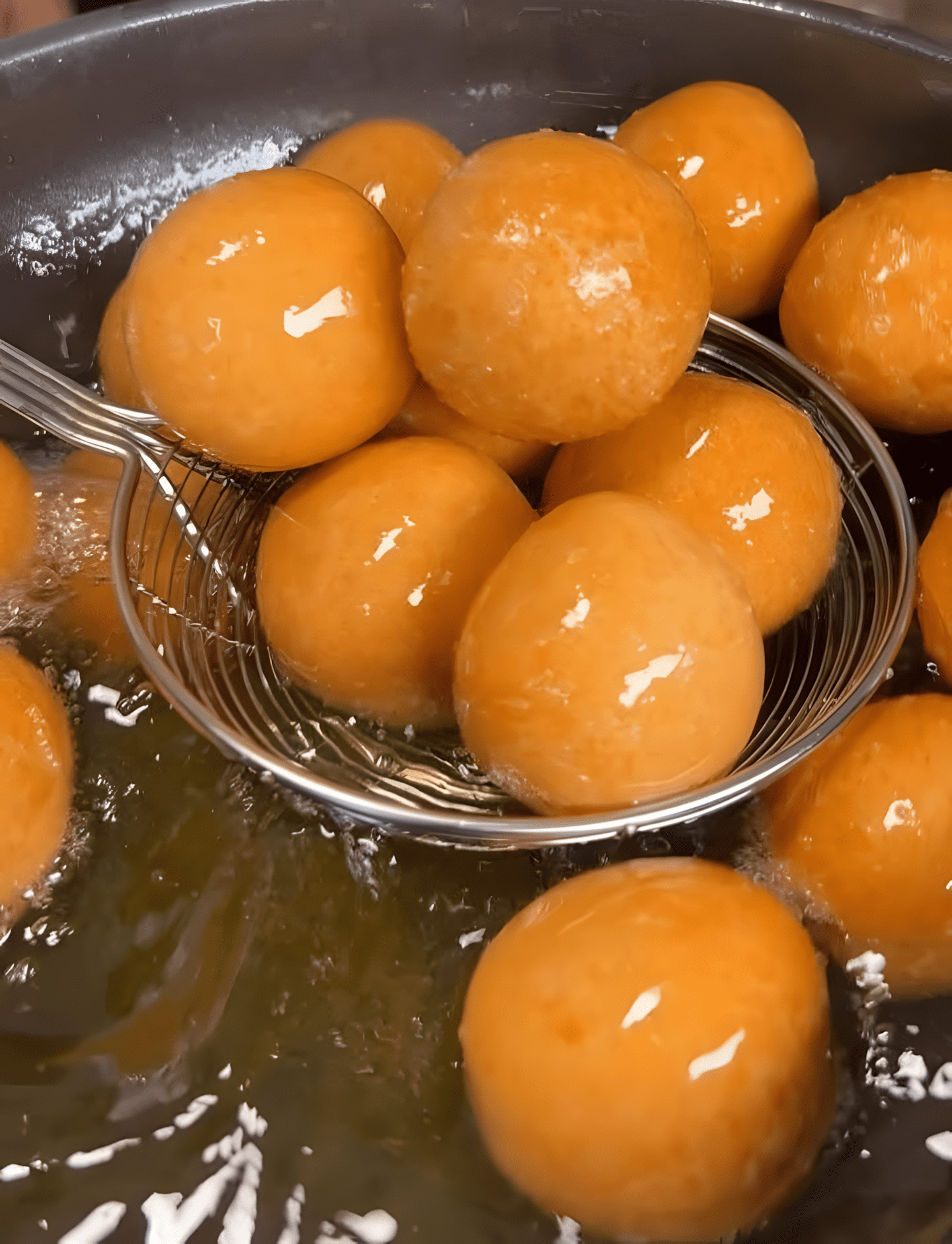 - Drop the dough balls into hot, deep oil (must be very hot).