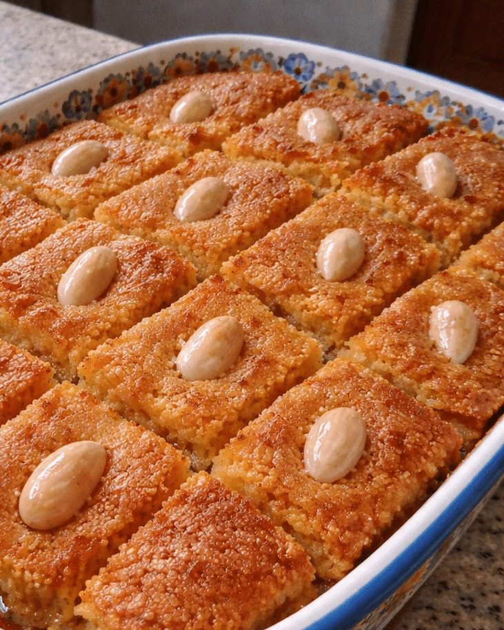 Een smeuïg griesmeelgebak dat perfect in balans is: niet luchtig zoals een cake, noch zwaar zoals halva. Met een licht vochtige binnenkant en een goudbruine bovenkant die het siroop mooi opneemt. De amandelen bovenop voegen een knapperige textuur en een elegante afwerking toe. Het geheim: warm gebak, koude siroop.
