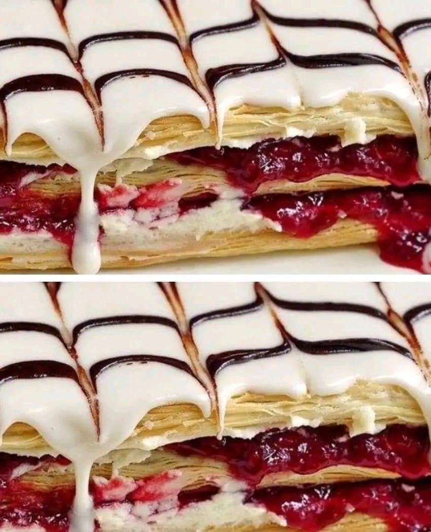 Ontdek ons frambozen-mille-feuille-recept dat uw smaakpapillen zal doen smelten! Een perfecte laagjes knapperige laagjes goudkleurig bladerdeeg, licht gezoete banketbakkersroom en een delicaat mengsel van verse frambozen. Dit dessert is eenvoudig te bereiden en zal uw gasten verrassen bij speciale gelegenheden of gewoon om uzelf te trakteren. Volg onze stapsgewijze handleiding om een resultaat te bereiken dat zowel heerlijk als visueel indrukwekkend is. Geniet van deze zoetheid die knapperige en zachte smaken combineert, en verwonder je over deze prachtige mille-feuille gegarneerd met sappige frambozen. Een echte explosie van smaken en kleuren om zonder mate te delen.