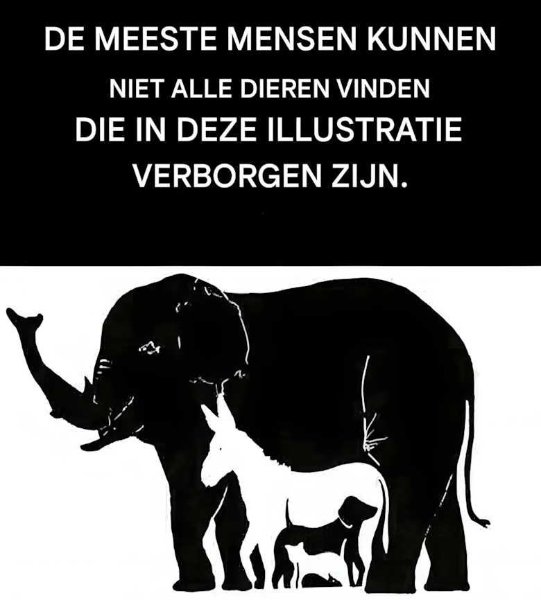 Er circuleert al een tijdje een afbeelding die zelfs de meest doorgewinterde kijkers uitdaagt. Op het eerste gezicht lijken er vijf dieren op afgebeeld: een olifant, een ezel, een hond, een kat en een muis. Maar de werkelijkheid is complexer: er zitten dertien dieren verborgen in deze tekening!