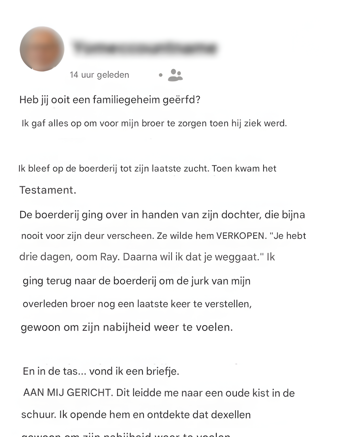 Maar ik had het mis. De echte klap kwam later, toen ik een brief ontdekte die verborgen lag in zijn oude schuur, met daarin een waarheid die niemand ooit had durven onthullen.