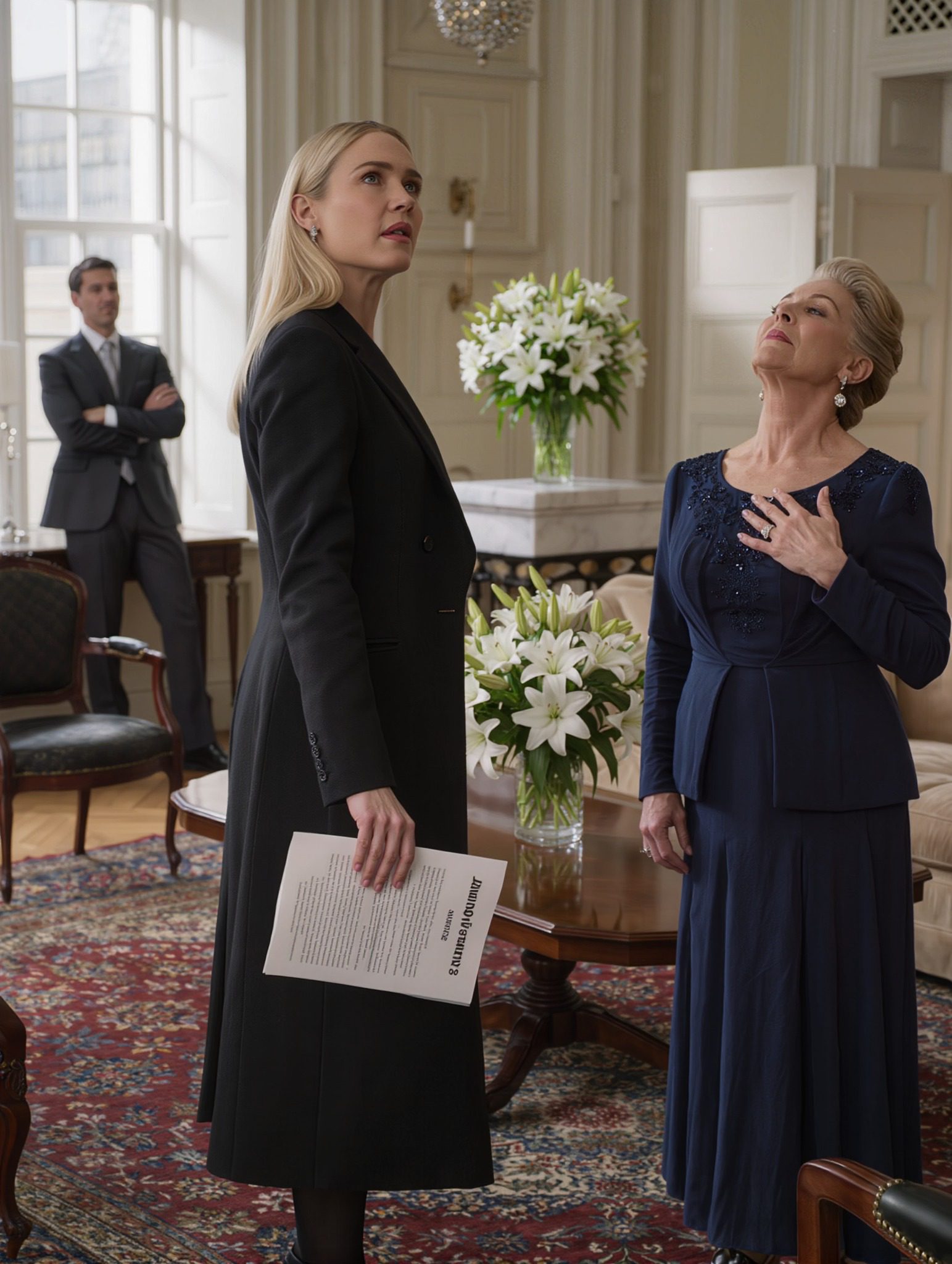 Het woord ‘regering’ klonk als een zweepslag in de lucht. Achter haar, vlak bij het raam, stond een vreemdeling met zijn handen in zijn zakken, het uitzicht bestuderend alsof hij er al eigenaar van was. Donker haar, designpak, verveelde uitdrukking. Hij zag eruit als een makelaar die liever ergens anders was dan met een rouwende dochter te maken te hebben.