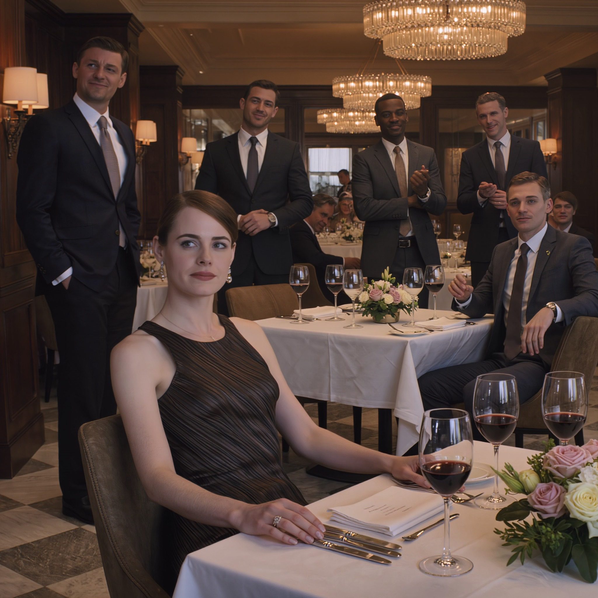Het kristallen glas voelde koel aan in mijn handpalm terwijl ik ze gadesloeg vanuit onze marmeren woonkamer. Vijf mannen in maatpakken, allemaal topmanagers bij Reynolds Technologies, allemaal door mij persoonlijk geselecteerd via verschillende lagen van schijnvennootschappen en discrete wervingsbureaus. En James – mijn man al acht jaar, hun vicepresident operations – die het koor van spot aanvoerde alsof het zijn geboorterecht was.